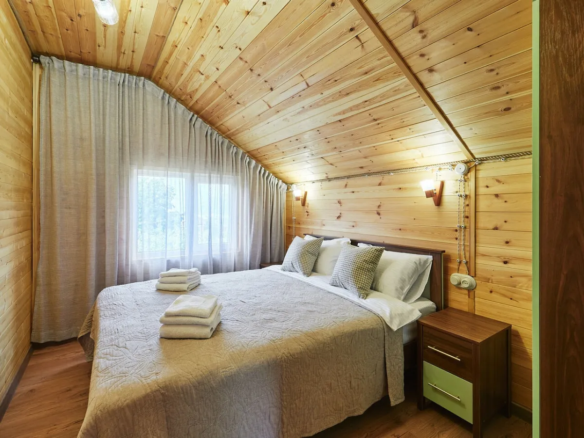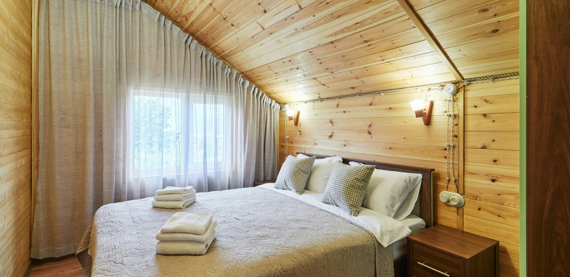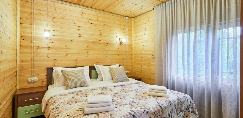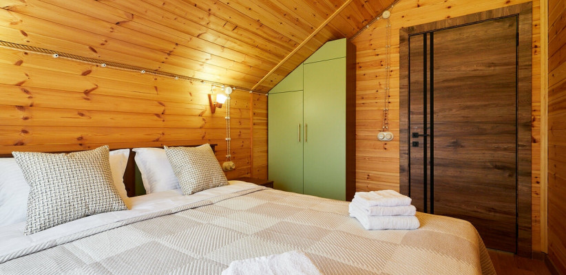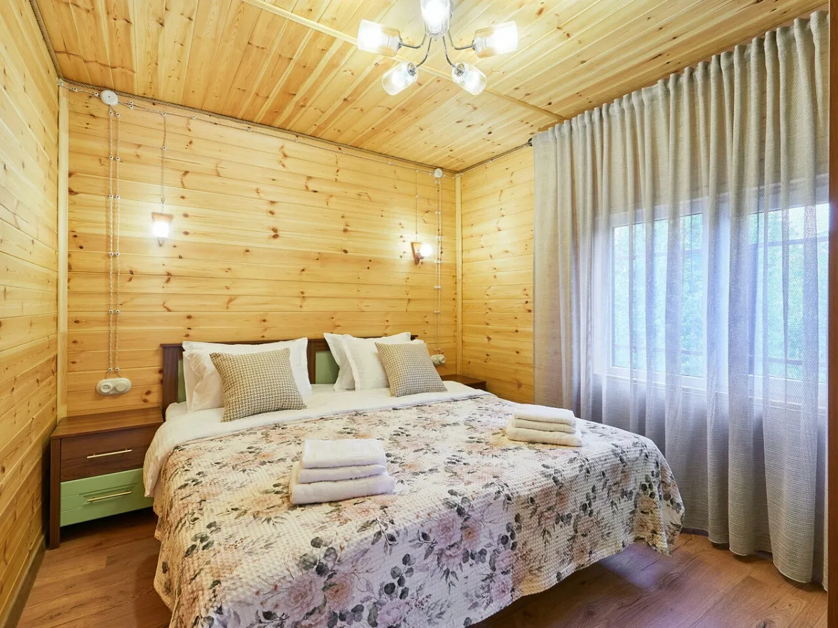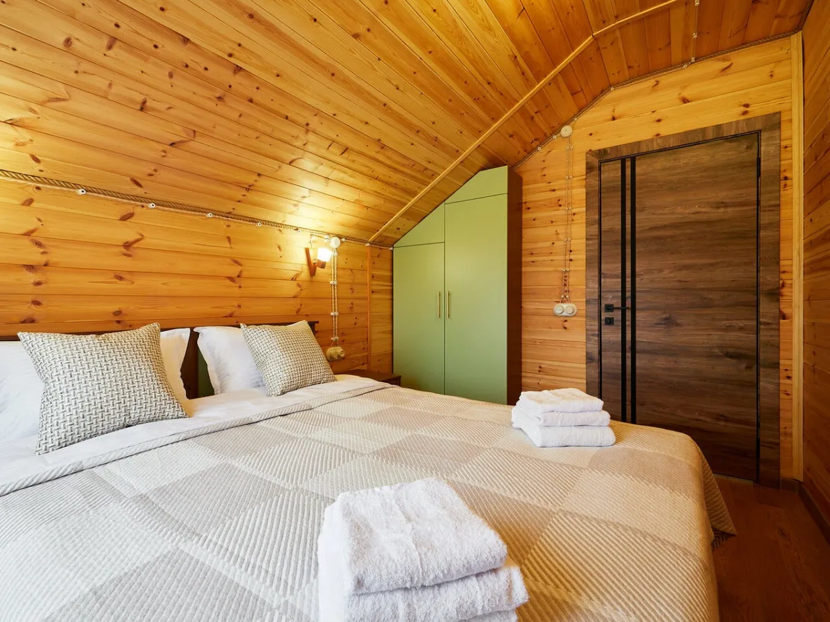 1 этаж: гостиная с обеденной зоной, раскладной диван, спальня с двуспальной кроватью, санузел. 2 этаж: две спальни – одна с двуспальной кроватью, другая с односпальной. В большинстве домиков – холл с креслами, столиком и дополнительным диваном (в одном домике холл отсутствует). Количество гостей: 6