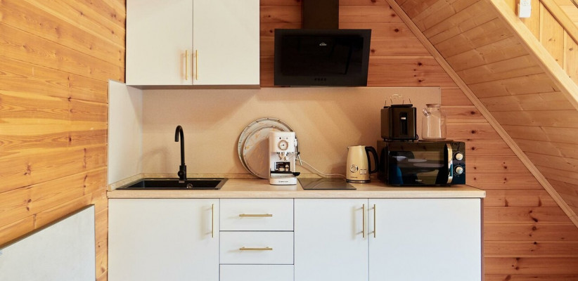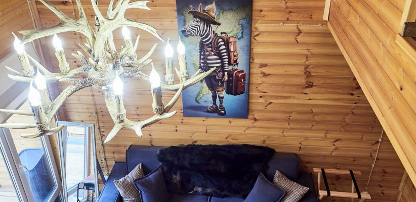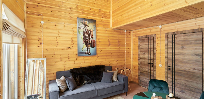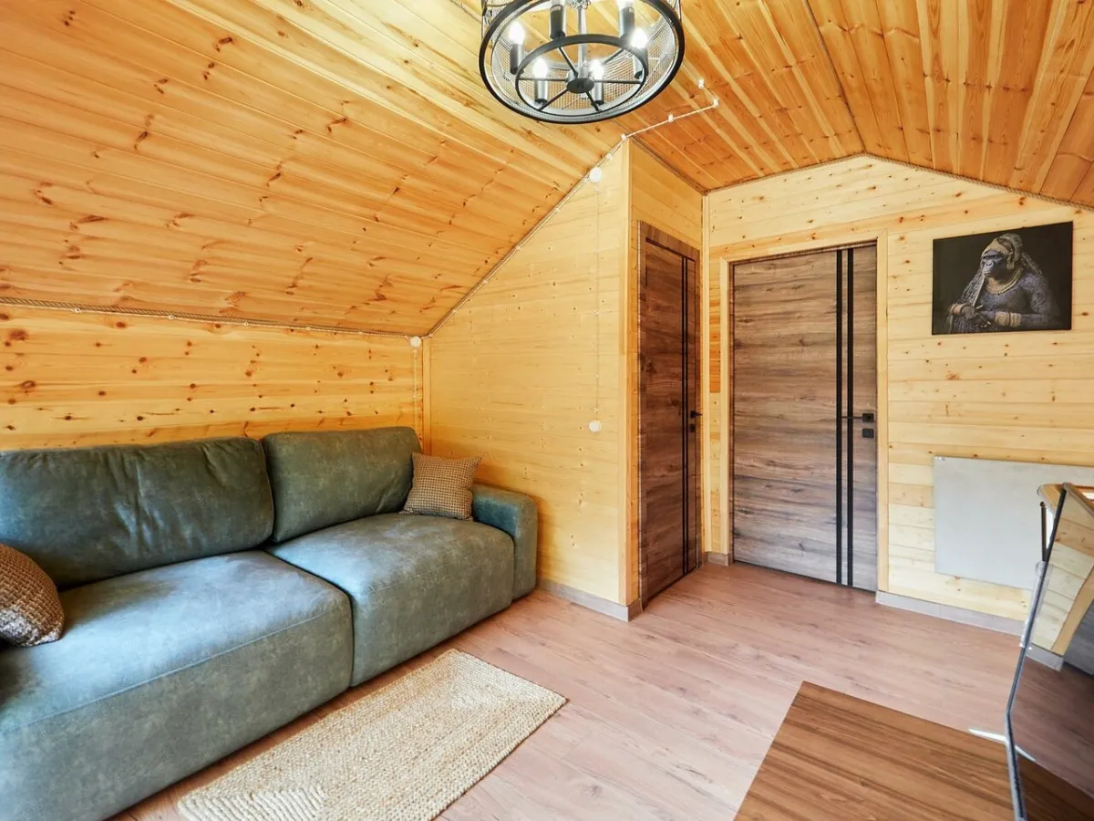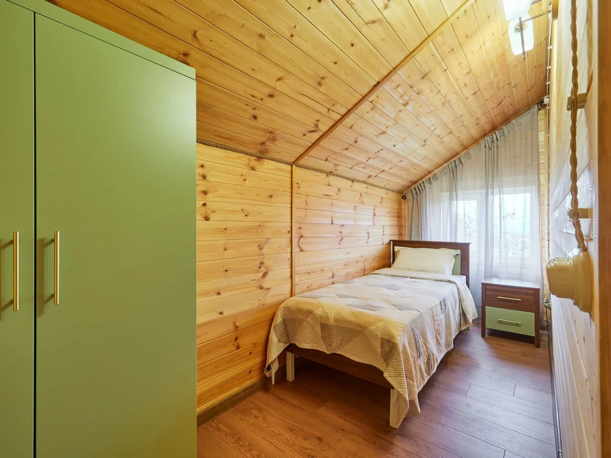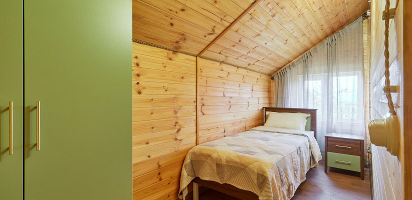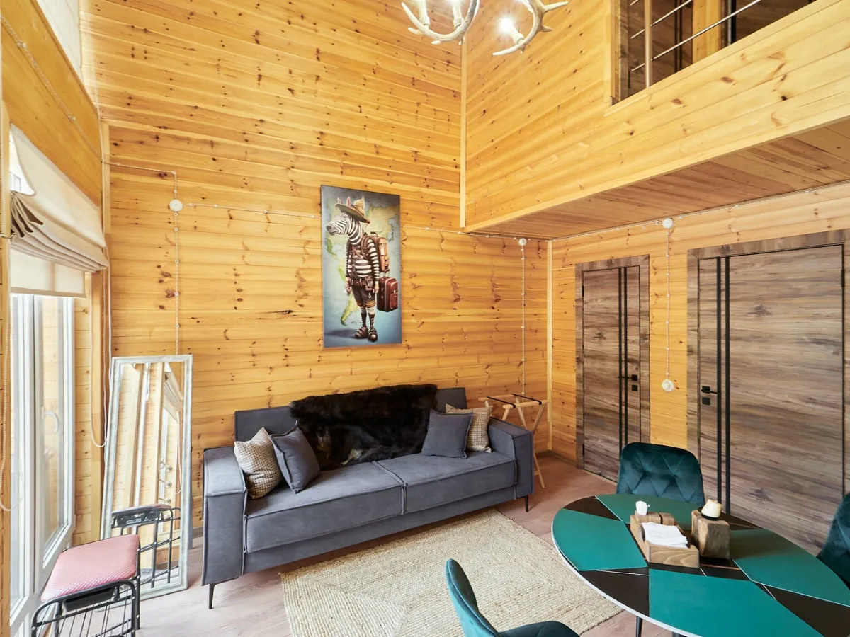 1 этаж: гостиная с обеденной зоной, раскладной диван, спальня с двуспальной кроватью, санузел. 2 этаж: две спальни – одна с двуспальной кроватью, другая с односпальной. В большинстве домиков – холл с креслами, столиком и дополнительным диваном (в одном домике холл отсутствует). Количество гостей: 6