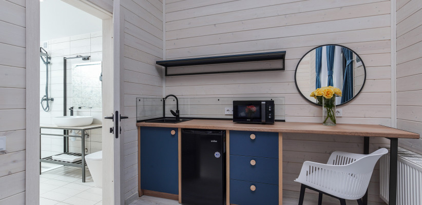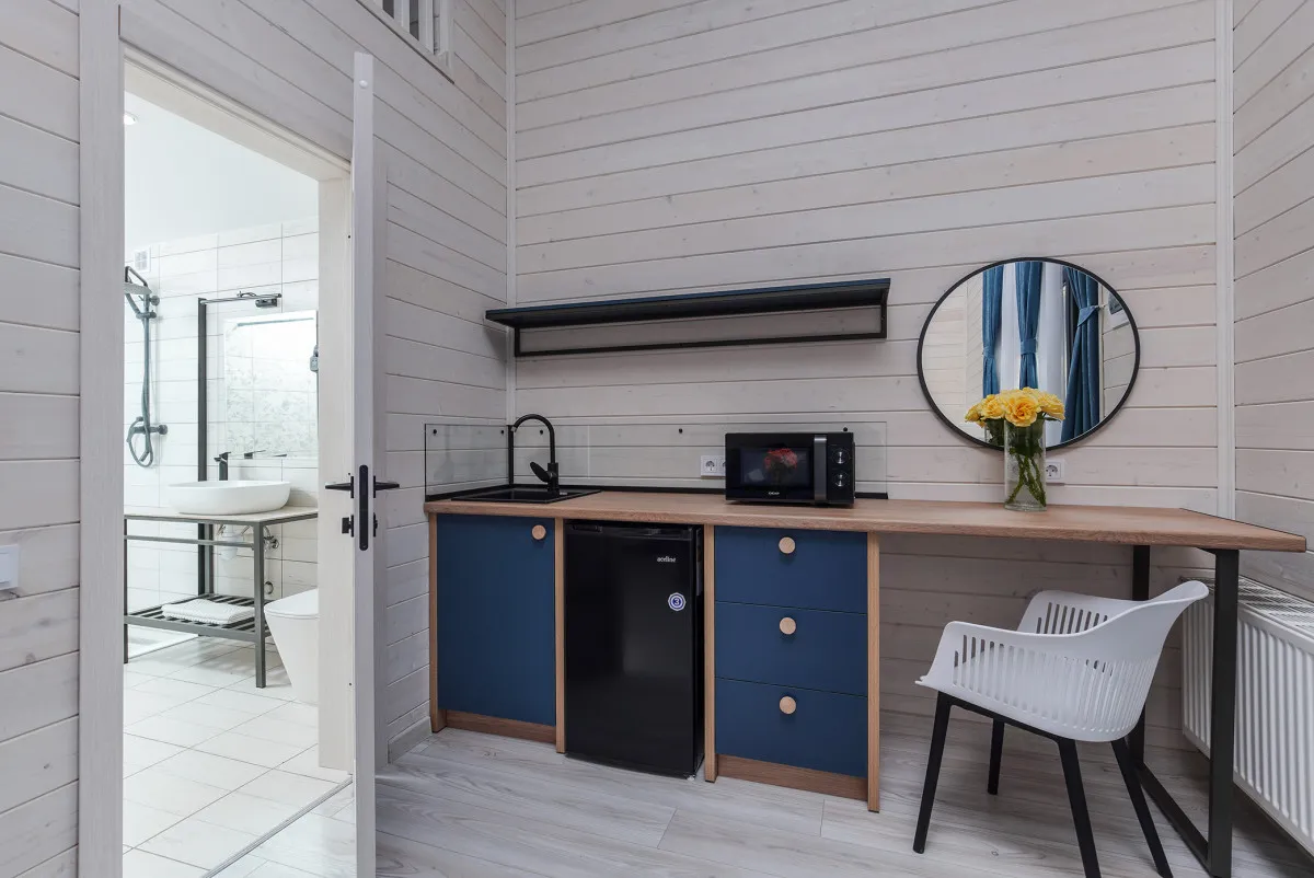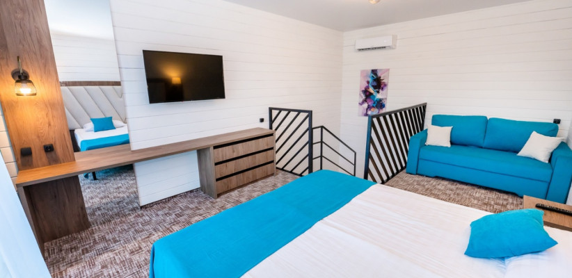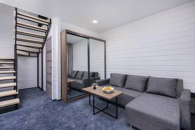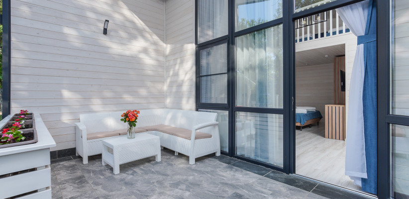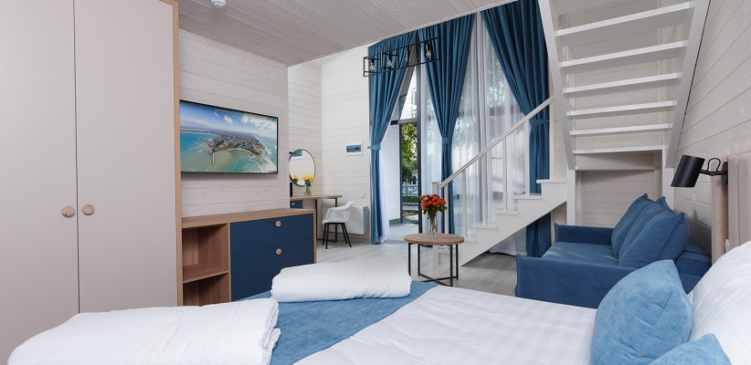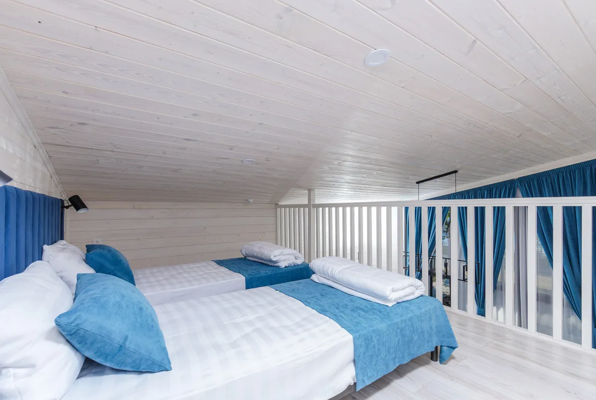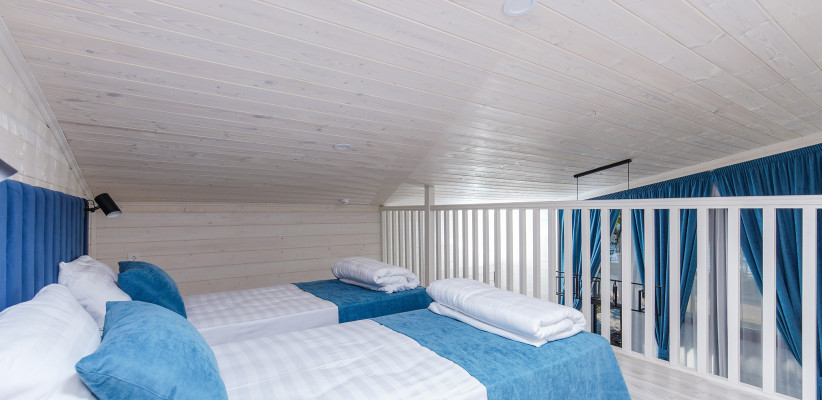 от 35 м2, 2-уровневый коттедж: терраса, на 1 уровне — спальная зона с двуспальной кроватью, гостиная с раскладным диваном, кухонный уголок и ванная комната; на 2 уровне — отдельная зона отдыха с двумя односпальными кроватями