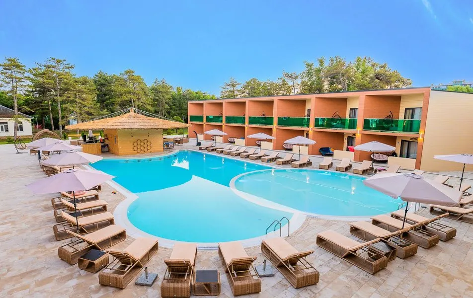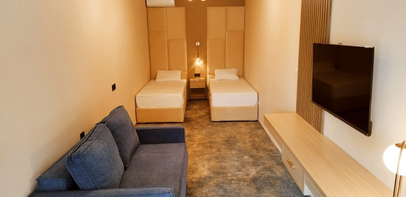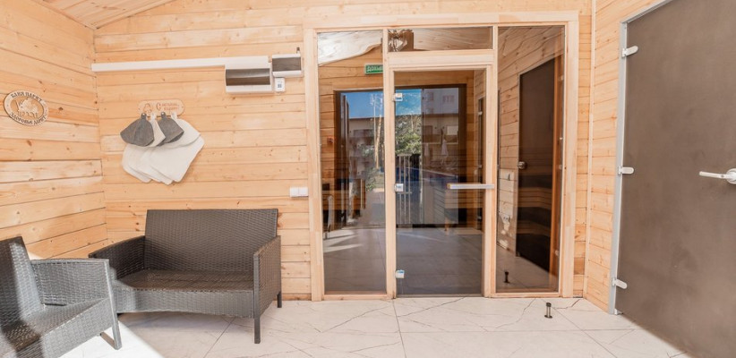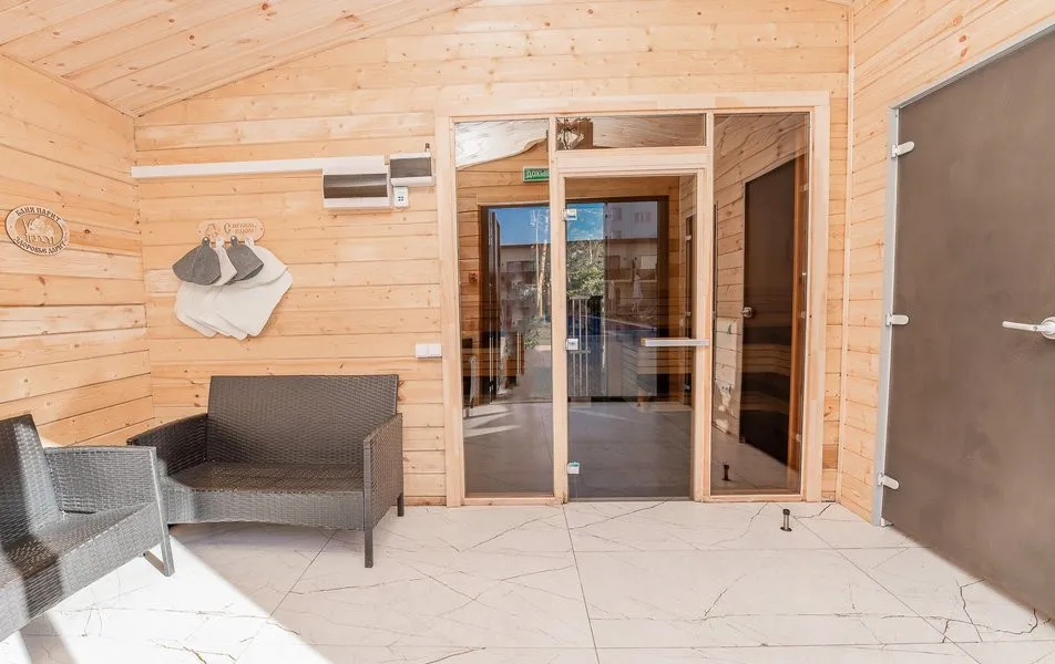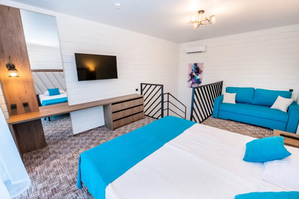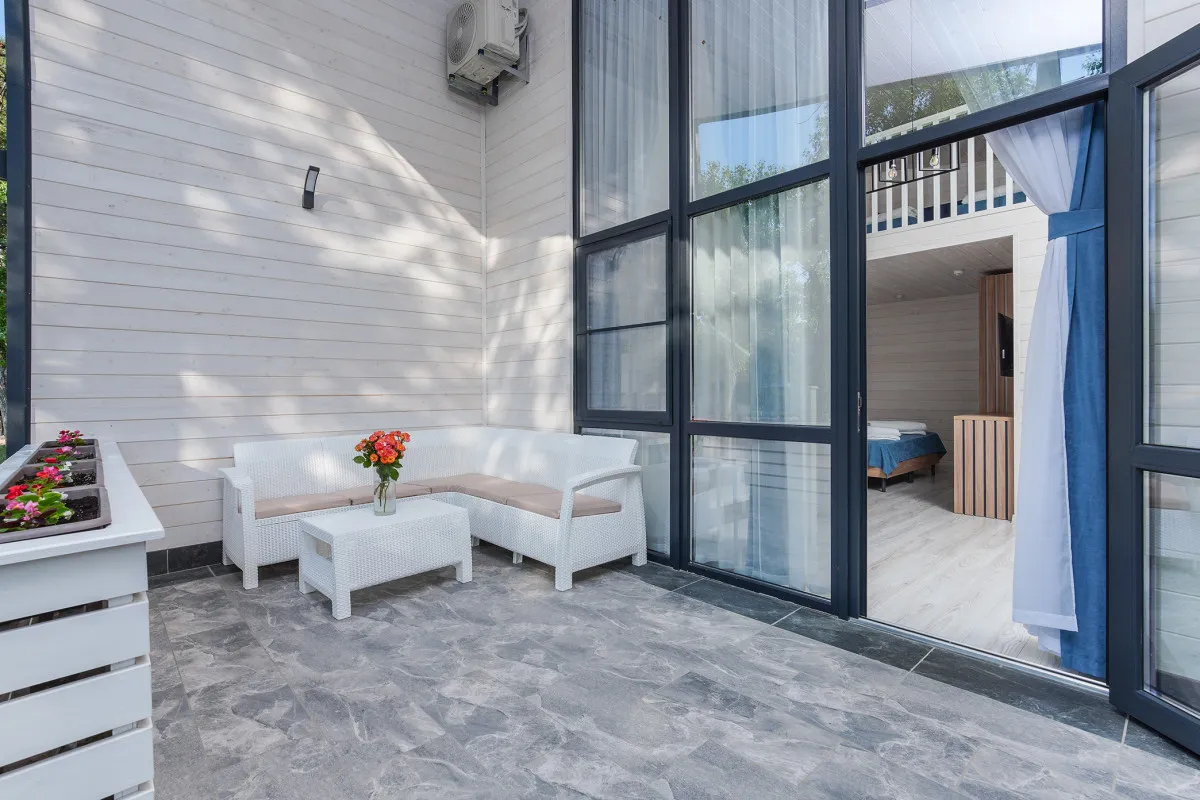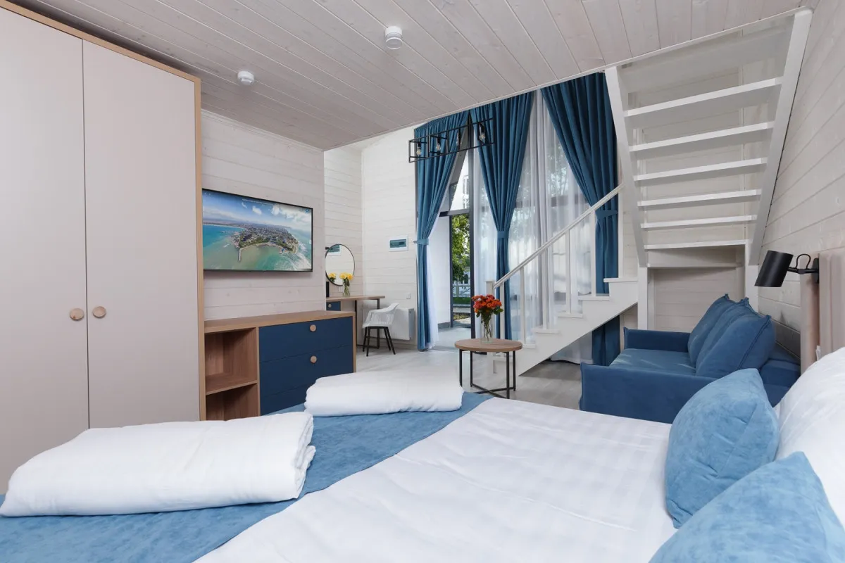 48 м2, 2-этажный коттедж с собственной террасой, расположенный в самом сердце парковой зоны, всего в 10 метрах от моря: на 1 этаже — гостиная с раскладным диваном для детей, на 2 — спальня для родителей с балконом. Рядом находится открытый бассейн с подогревом, детской чашей и джакузи, барBarn House/ Коттедж 6-местный