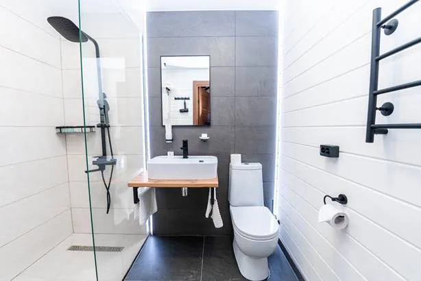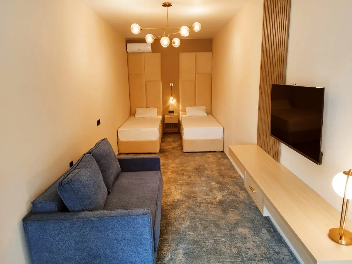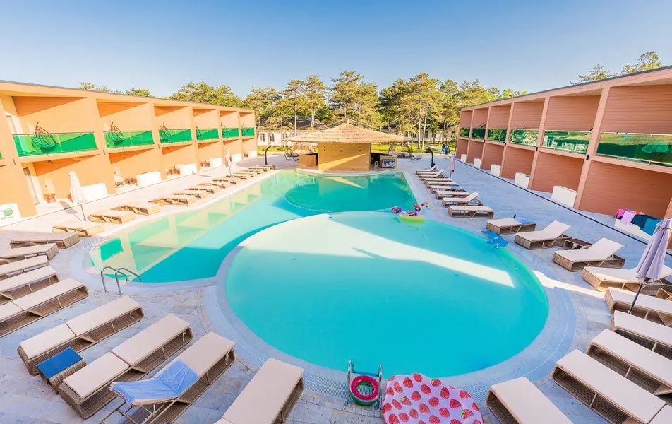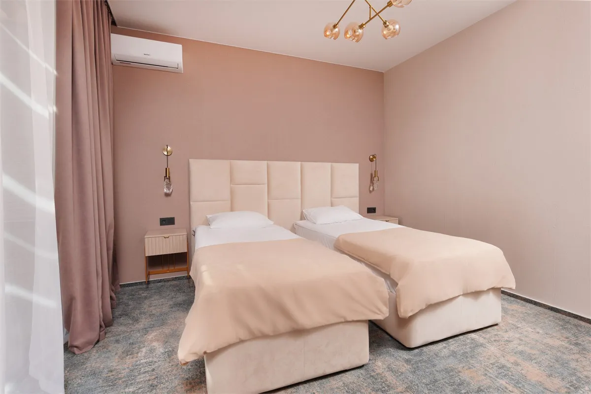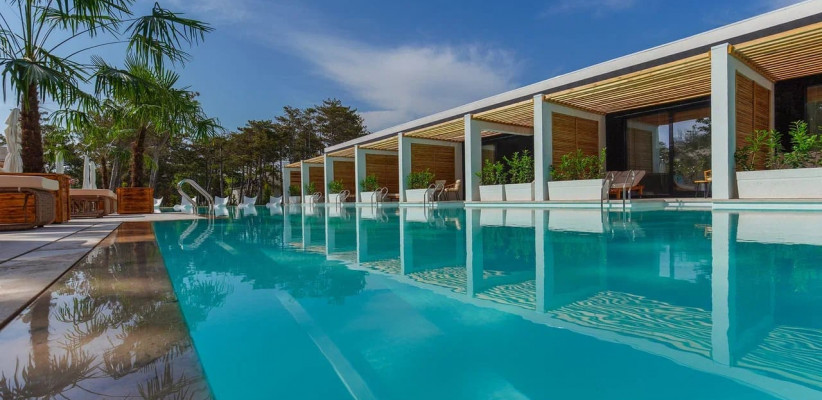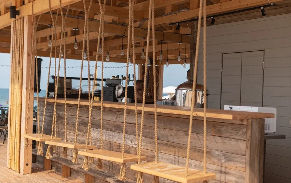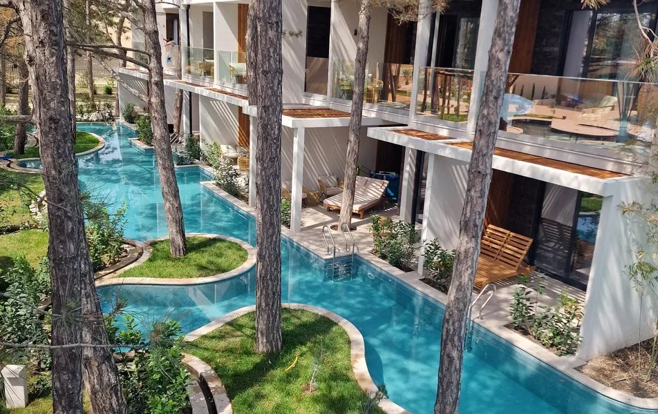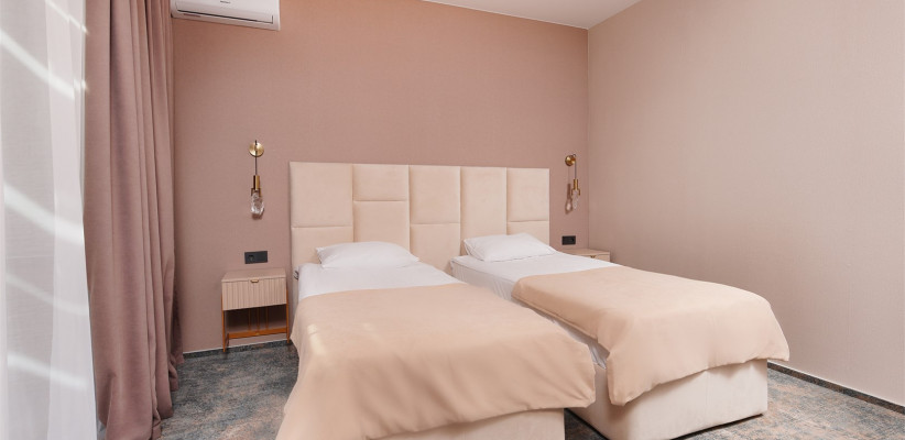 48 м2, 2-этажный коттедж с собственной террасой, расположенный в самом сердце парковой зоны, всего в 10 метрах от моря: на 1 этаже — гостиная с раскладным диваном для детей, на 2 — спальня для родителей с балконом. Рядом находится открытый бассейн с подогревом, детской чашей и джакузи, барBarn House/ Коттедж 6-местный