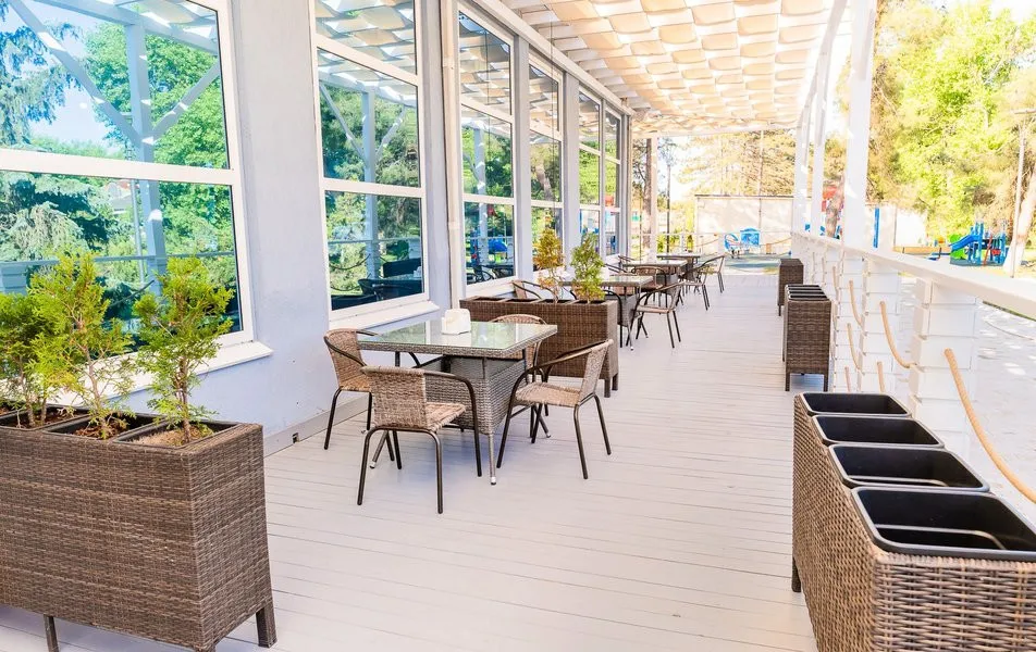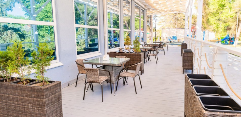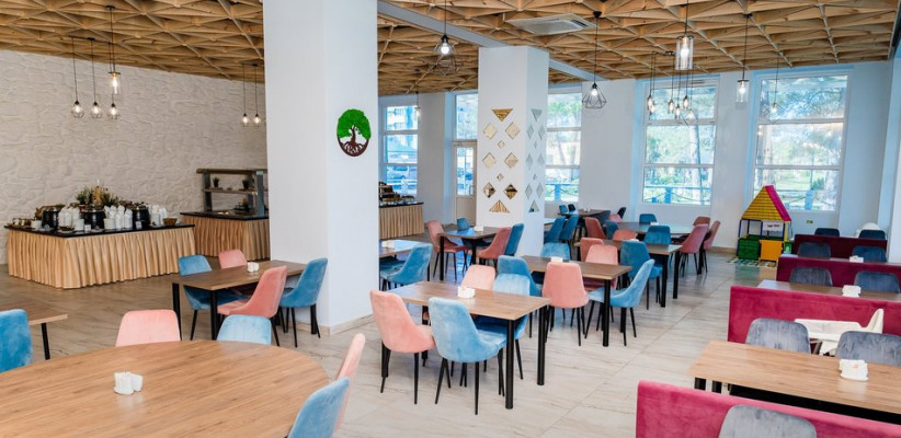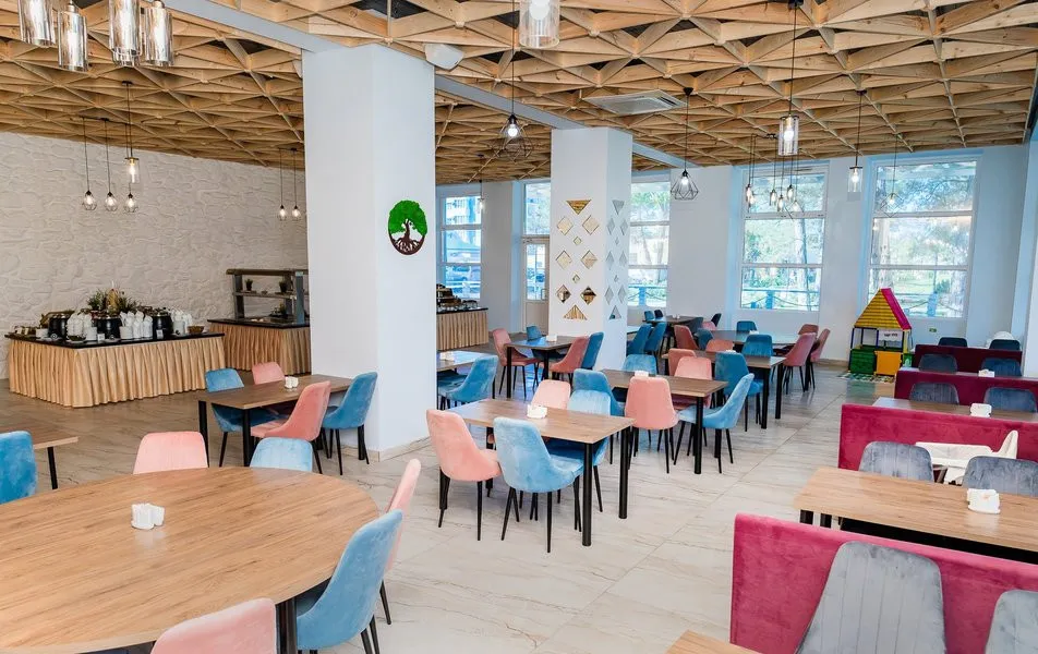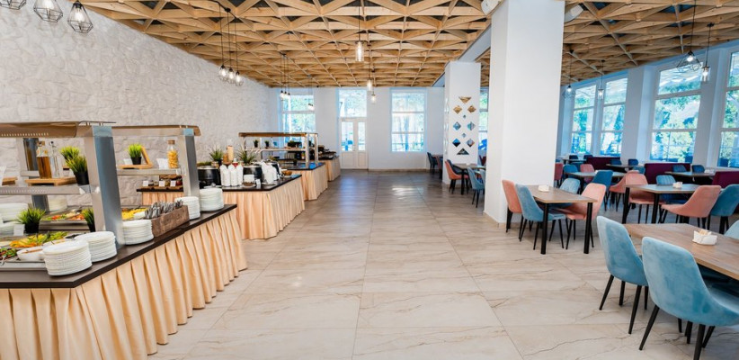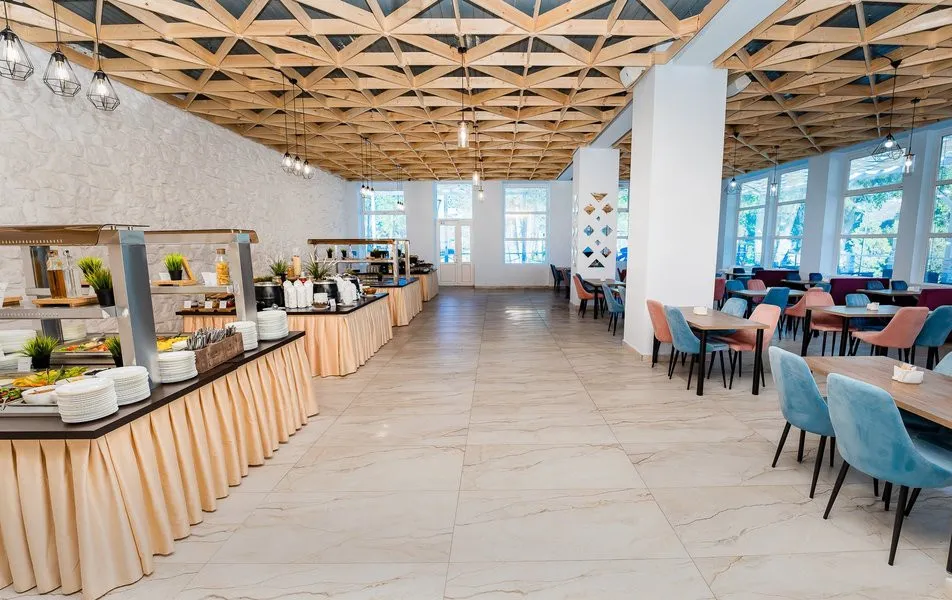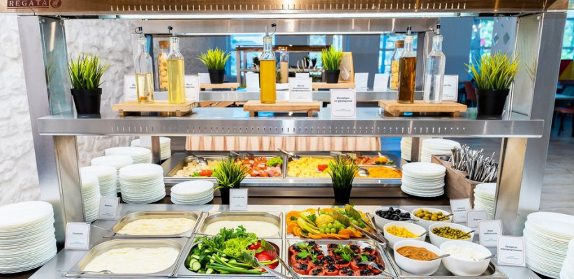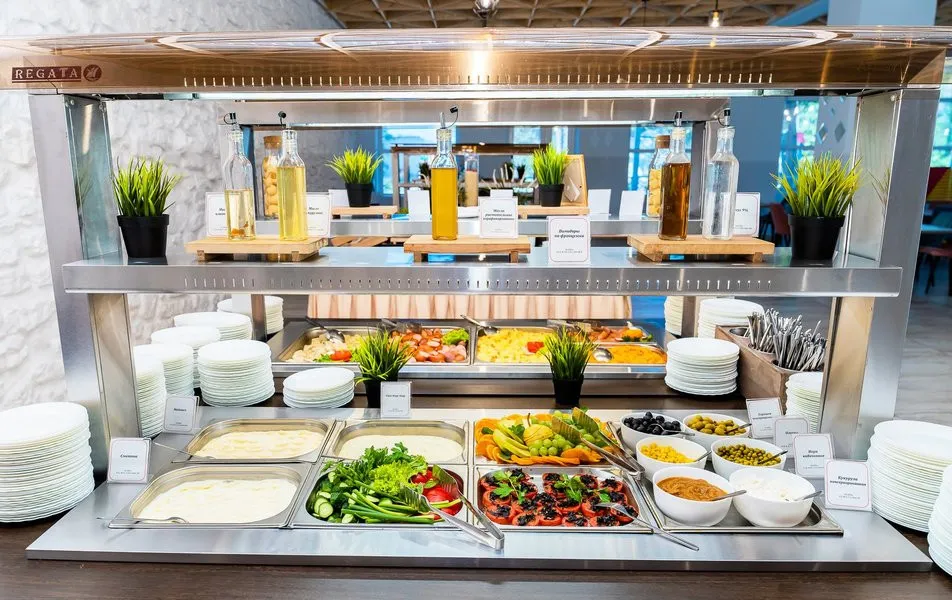 3-разовое питание «шведский стол» (завтрак, обед, ужин, 2 промежуточных перекуса). Предлагаются блюда из мяса, рыбы и овощей, сезонные фрукты, выпечка, напитки и десерты.