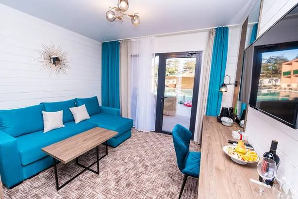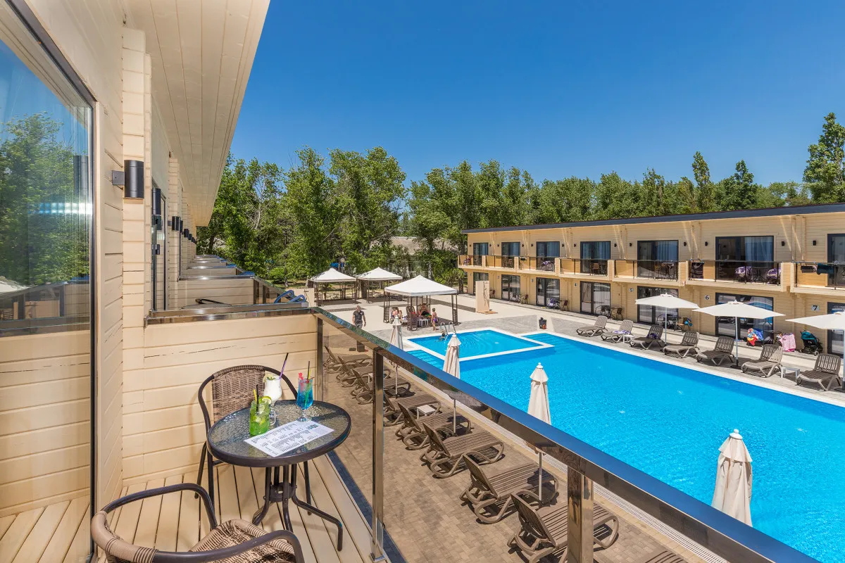 48 м2, 2-этажный коттедж у большого бассейна: на 1 этаже — гостиная с диваном, на 2 — спальня с балконом. А прямо за дверью — дорожка к бассейну с детской чашейSea Village Premium/ Премиум