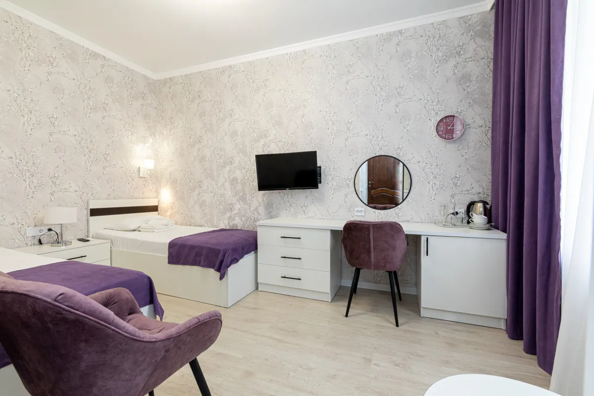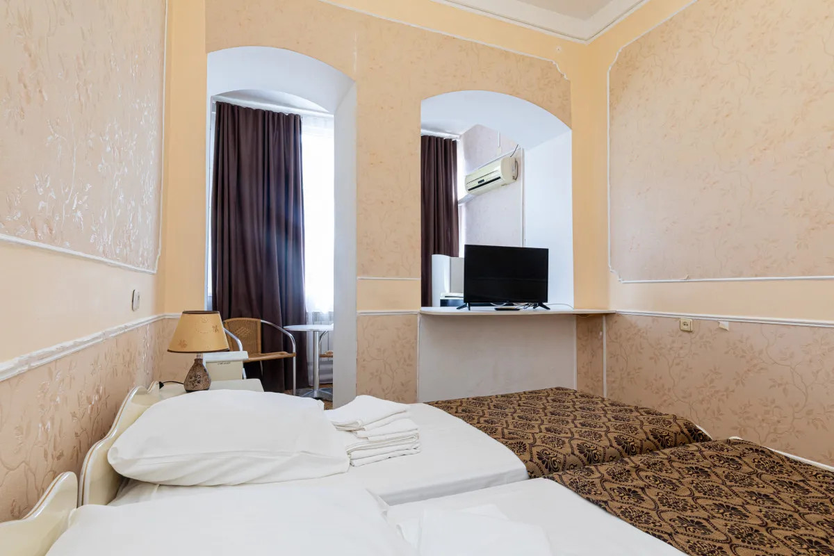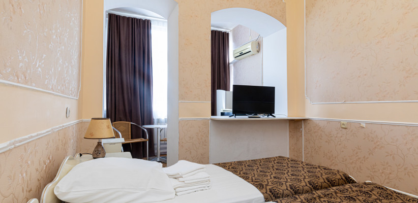 15 м2, 2 односпальные кровати, номера находятся на 4-м этаже (корпус без лифта), количество гостей: 2 основных места + 2 дополнительных