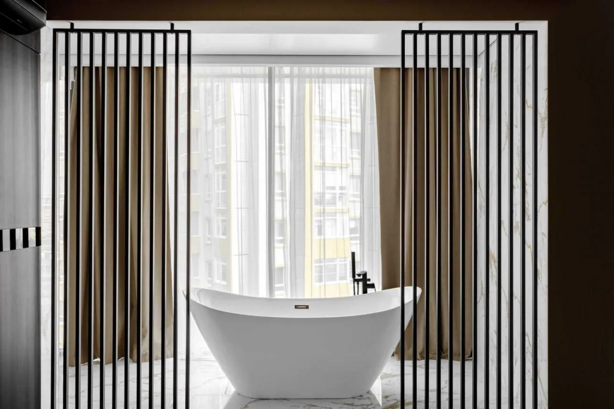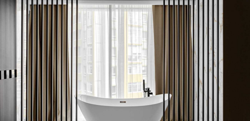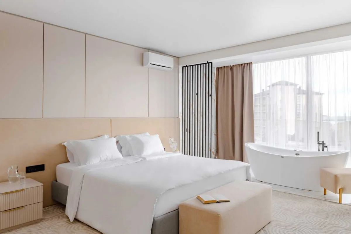 100 м2, балкон, две спальни (двуспальная кровать и отдельно стоящая ванна; две односпальные кровати) две ванные комнаты, гостиная с мини-кухней, три телевизора. Количество гостей: 4