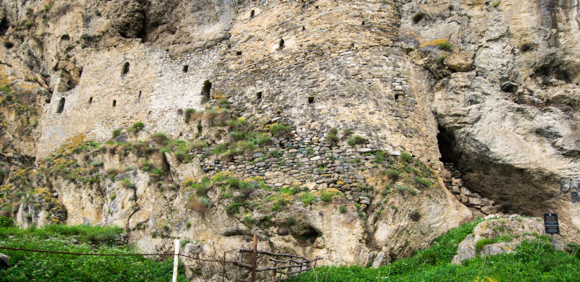 Скальная крепость Дзивгис. Крепость датируется временами нашествия Тамерлана, то есть примерно 15 веком. Удивительное по тактической хитрости сооружение, созданное горцами для защиты от вражеских набегов.