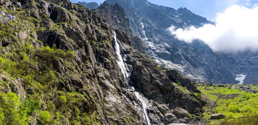 Вскоре лес расступается, туристы оказываются в зоне альпийских лугов и в обрамлении высоких гор впереди блестит ледник. Ледник словно дышит, постоянно шумит и живет своей жизнью. Можно подойти ближе почувствовать его мощь и неукротимый нрав, ощутить природную стихию. Из ледяного грота ледника стремительным бурным потоком вырывается река Цейдон.