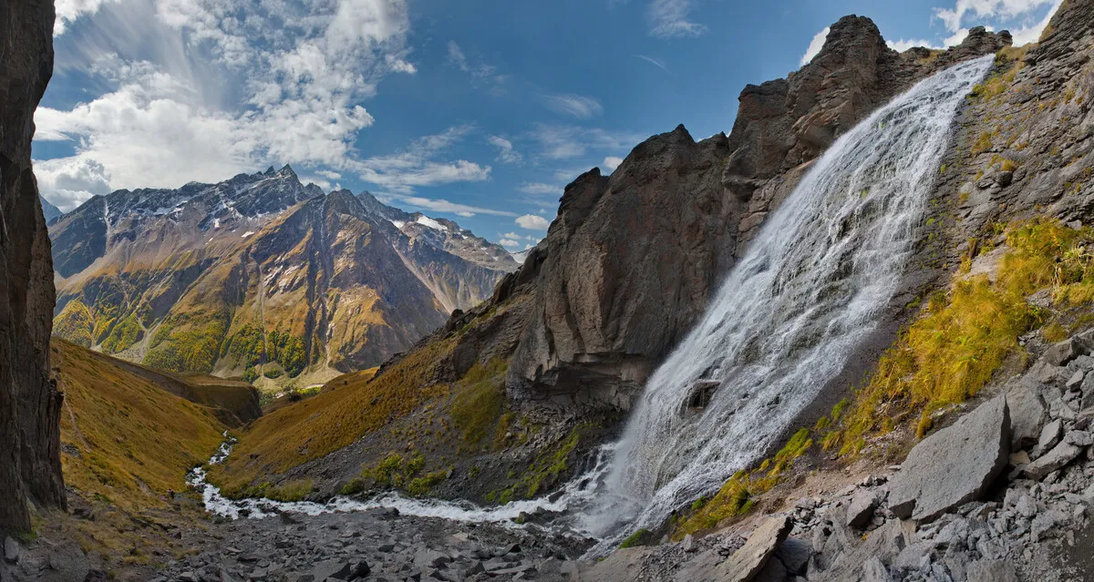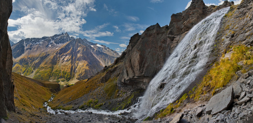 Главный водопад Мидаграбинской долины – Большой Зейгалан. Высота падения водопада 750 метров – это самый крупный водопад в Осетии и один из самых высоких в Европе. Зейгалан очень мощный, поэтому вместе со студеными брызгами несет крупные камни, а также фрагменты ледника.