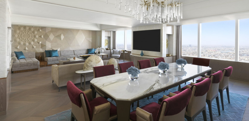 240 м2, 44 и 46 этажи, панорамный вид на город. Одна кровать king-size, одна раскладная кровать или одна детская кровать. Возможно объединение смежных номеров. Максимальное количество гостей: 3 взрослых или 2 взрослых и 1 ребенок.Presidential Suite