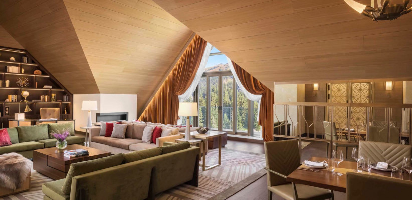 253 м2, гостиная с двумя двухместными диванами, журнальным столиком и книжным шкафом, две спальни с двуспальными кроватями, смежная комната для размещения персонала, небольшая отдельная кухня с полным набором кухонных принадлежностей, обеденный стол на 10 гостей, угловой камин в гостиной, 70-дюймовый телевизор в гостиной и 43-дюймовый встроенный телевизор в главной спальне, отдельный лифт из вестибюля отеля прямо в люкс, вид на горнолыжный склон и деревню Копаоник
