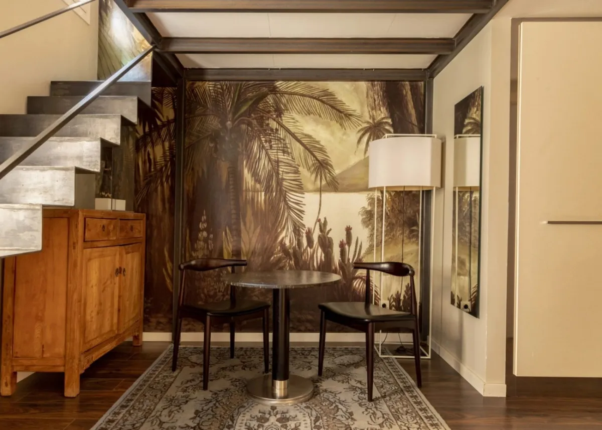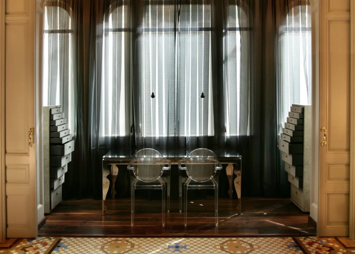 Отель занимает историческое здание начала XX в., сохранившее оригинальные архитектурные элементы, такие как высокие потолки с лепниной и мозаичные плитки. К числу наиболее уникальных элементов, безусловно, относятся фрески на потолках с аллегориями эпохи Возрождения, которые были полностью отреставрированы и восстановлены.