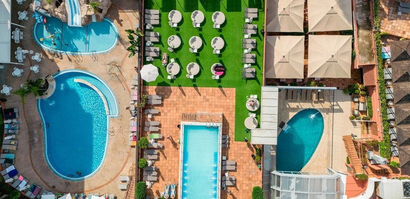 Отель предлагает развитую инфраструктуру: несколько бассейнов, включая семейные и отдельную зону только для взрослых, а также террасы и зоны отдыха с видом на море.