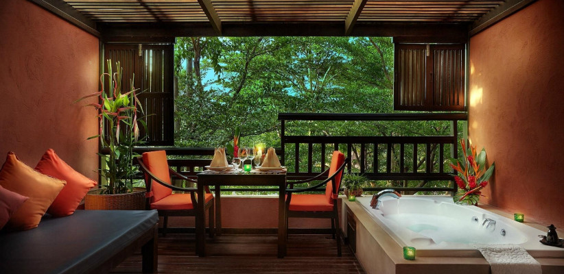 Отдельно стоящие виллы ближе всего к пляжу, имеют собственный небольшой сад и джакузи в саду, номер с визуальным делением на зону гостиной и зону спальни