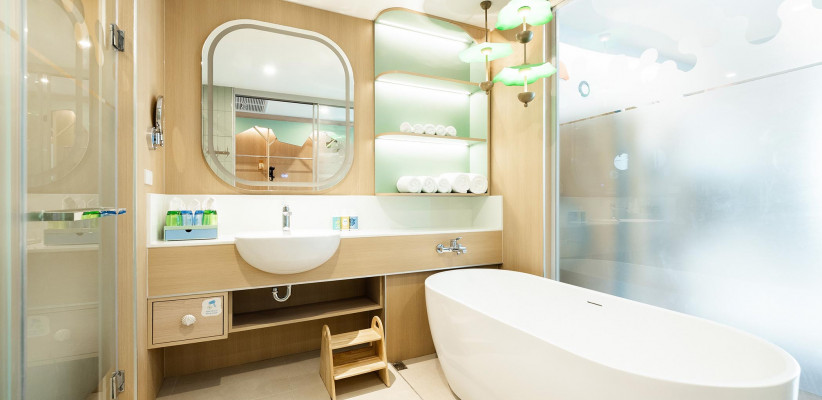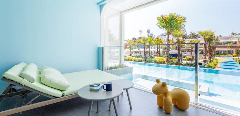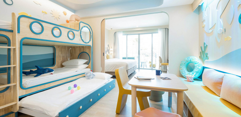 55 м2, кровать king-size, детская кровать с дополнительным выдвижным спальным местом, ванная комната с ванной и тропическим душем, балкон, вид на аквапарк. Максимальное количество гостей: 2 взрослых и 2 детей до 12 лет.Pool Access Family – семейный номер с доступом к бассейну
