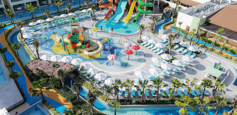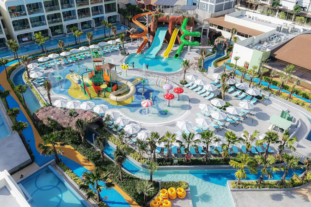 - В отеле три крыла с разными концепциями отдыха: Thani Wing с люксами для уединенного отдыха на берегу моря, Bhuri Wing для активных туристов, Vhari Water Park Wing для семейного отдыха.