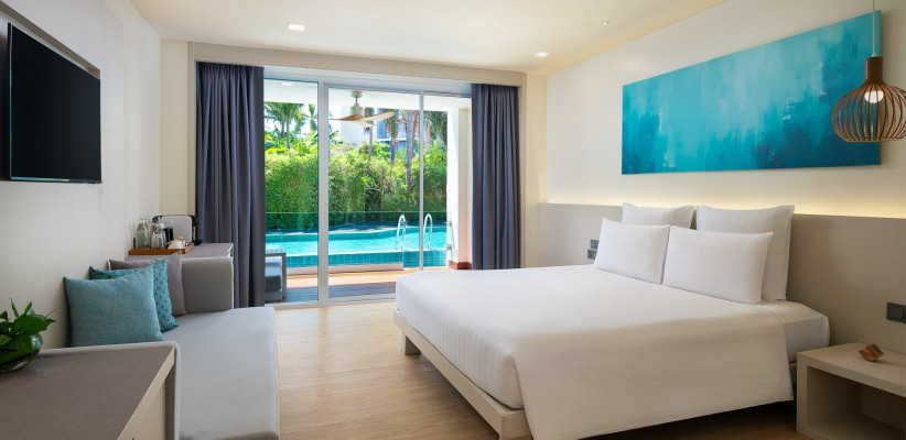38 м2, номер на нижнем этаже с балконом, видом на сад, одной кроватью king-size или двумя односпальными кроватями, ванной и / или тропическим душем в ванной комнате. Доступно размещение одной дополнительной кровати.Pool View Room – номер с видом на бассейн