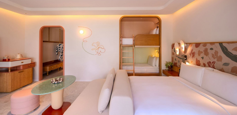 75 м2, вид на море, большая двуспальная кровать (king), зона отдыхаСемейный двухъярусный номер с одной большая двуспальная кровать (King) и одной двухъярусной кроватью