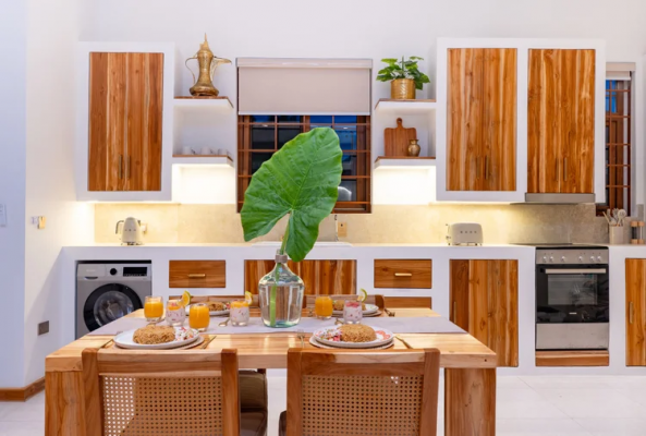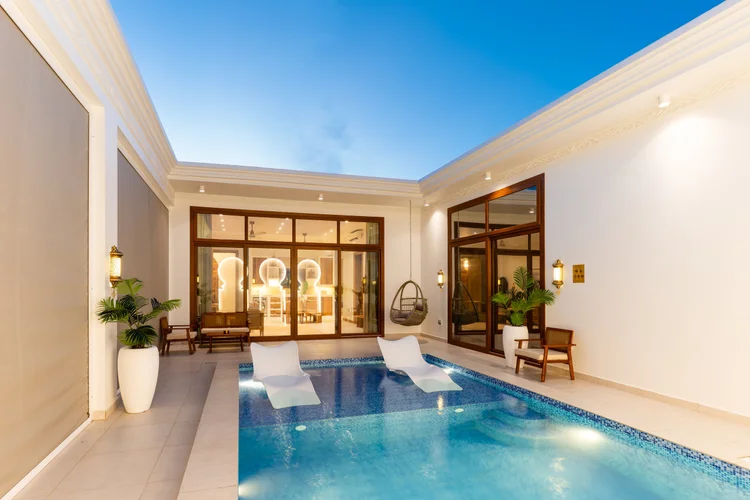 терраса с видом на бассейн, спальня, гостиная зона, оборудованная кухня с обеденной зоной, ванная комната с отдельно стоящей ванной