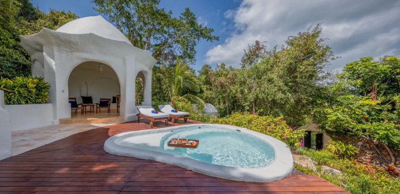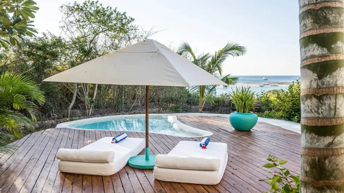 номер с бассейном, террасой с видом на океан, кроватью, журнальным столом, ванной комнатой с душем на открытом воздухе.Two Bedroom Garden View Luxury Pool Pavilion