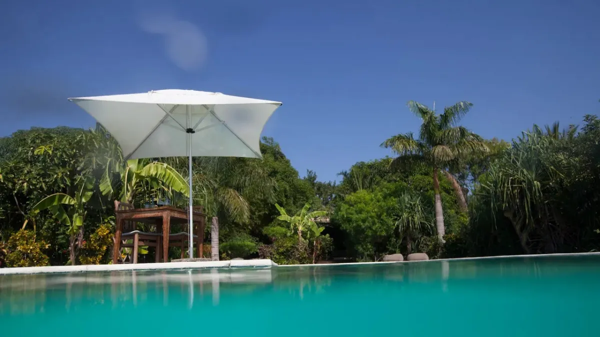 номер с бассейном, террасой с видом на сад, кроватью, журнальным столом, ванной комнатой с душем на открытом воздухе.Ocean View Luxury Pool Pavilion