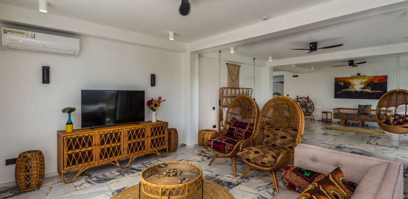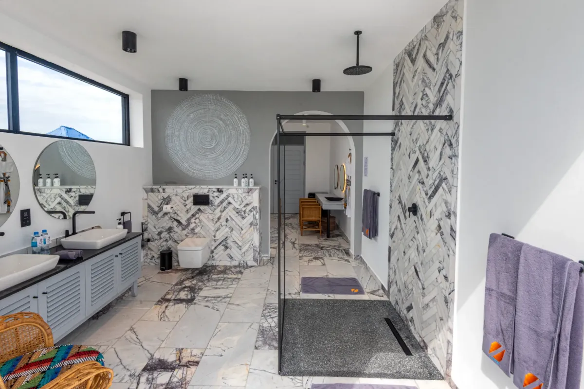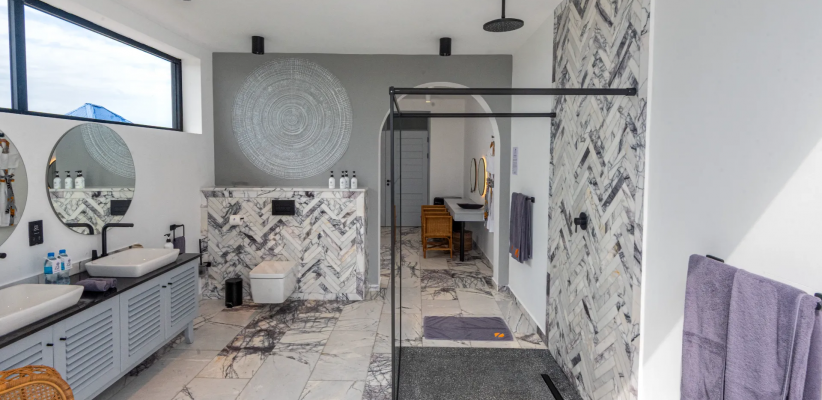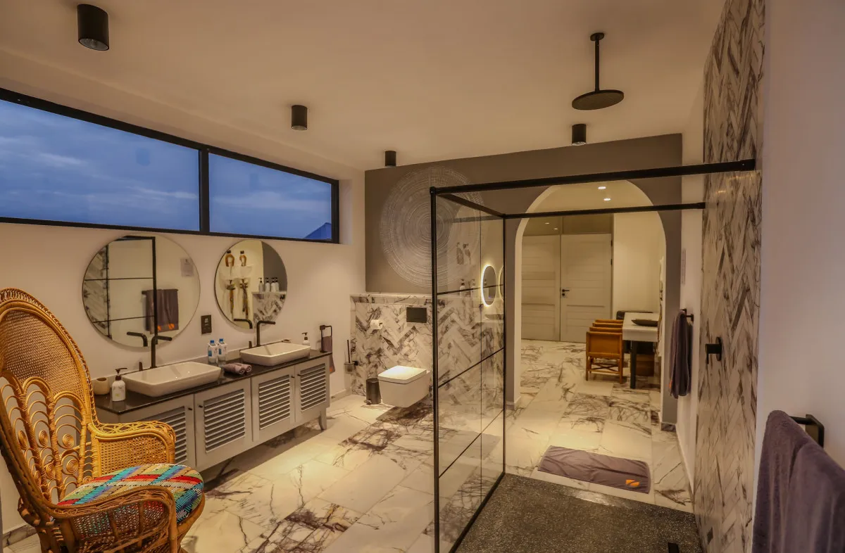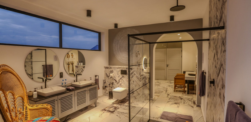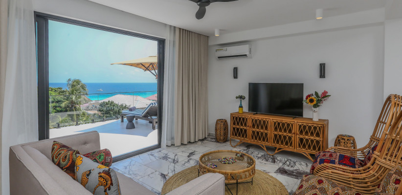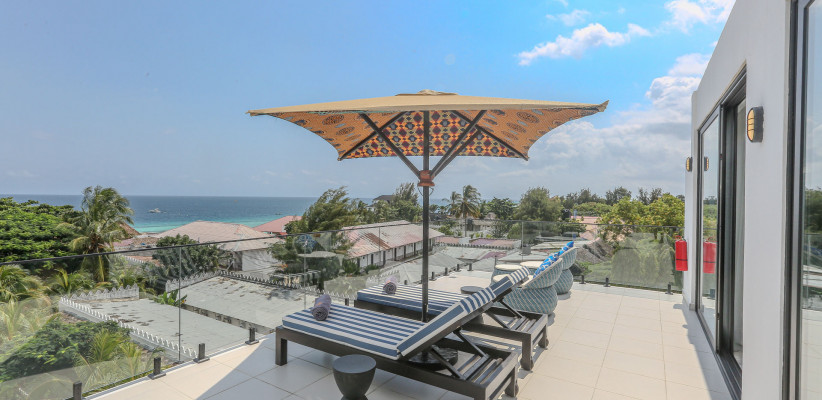220 м2, терраса по всему периметру люкса, вид на океан, двуспальная кровать или двуспальная кровать + односпальная кровать, гостиная, гардеробная