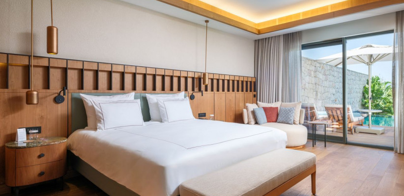 60-70 м2 (включая террасу), 1 большая двуспальная кровать + диван или 2 полутораспальные кровати + кресло. На просторной террасе, выходящей к бассейну с подогревом, есть 2 шезлонга и стол со стульями. Количество гостей: 2+1/3Номер Deluxe Swim-Up / Морская сторона(2 чел) (Зона для взрослых 16+)