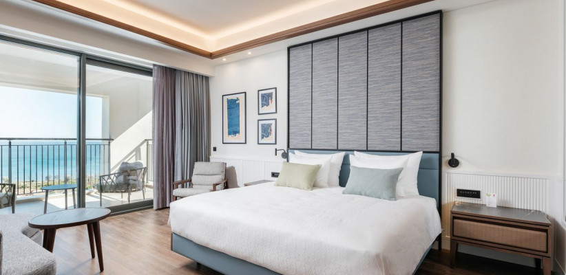 46 м2 (включая балкон), 1 большая двуспальная кровать + кресло или 2 полутораспальные кровати + кресло. Количество гостей: 2+1/3Номер Deluxe с видом на море (2+1/3 чел) (Смешанная Зона)