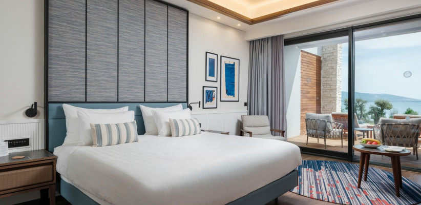 67 м2 (включая террасу),1 большая двуспальная кровать или 2 полутораспальные кровати, диван и кресло. На просторной террасе, выходящей к бассейну с подогревом, есть 2 шезлонга и стулья со столиком. Количество гостей: 2Номер Deluxe с видом на море (2 чел) (Зона для взрослых 16+)
