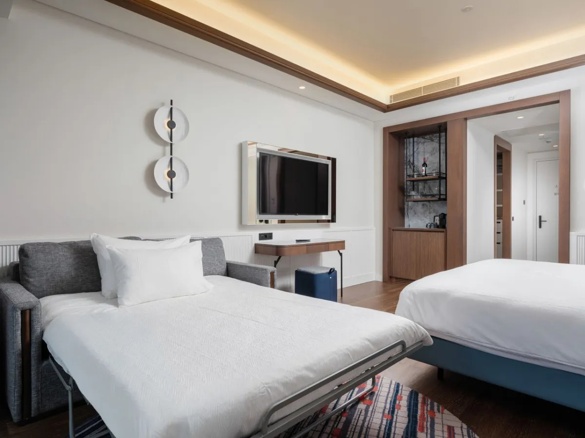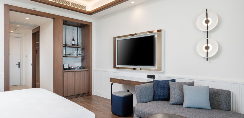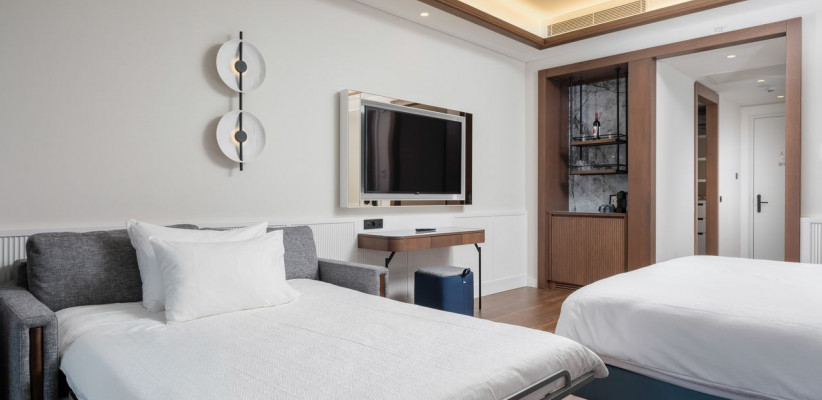 92 м2 (включая балкон), сьют состоит из двух независимых делюкс-номеров, соединенных общим коридором с дверью. Две спальни: с 1 кроватью super king-size + кресло и с двумя кроватями queen-size. 2 ванные комнаты. Количество гостей: 4+1/5Семейный сьют Deluxe с видом на море (4+1/5 чел) (Семейная Зона)