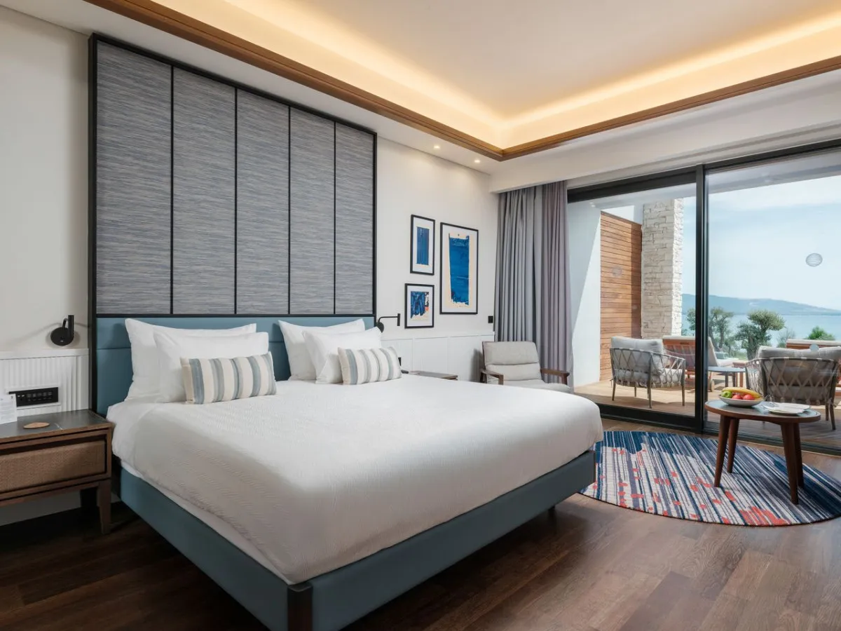 60-70 м2 (включая террасу), 1 большая двуспальная кровать и диван. На просторной террасе, выходящей к бассейну с подогревом, есть 2 шезлонга и стол со стульями. Количество гостей: 2+2Номер Deluxe Double 4 с видом на море (2+2 чел) (Смешанная Зона)
