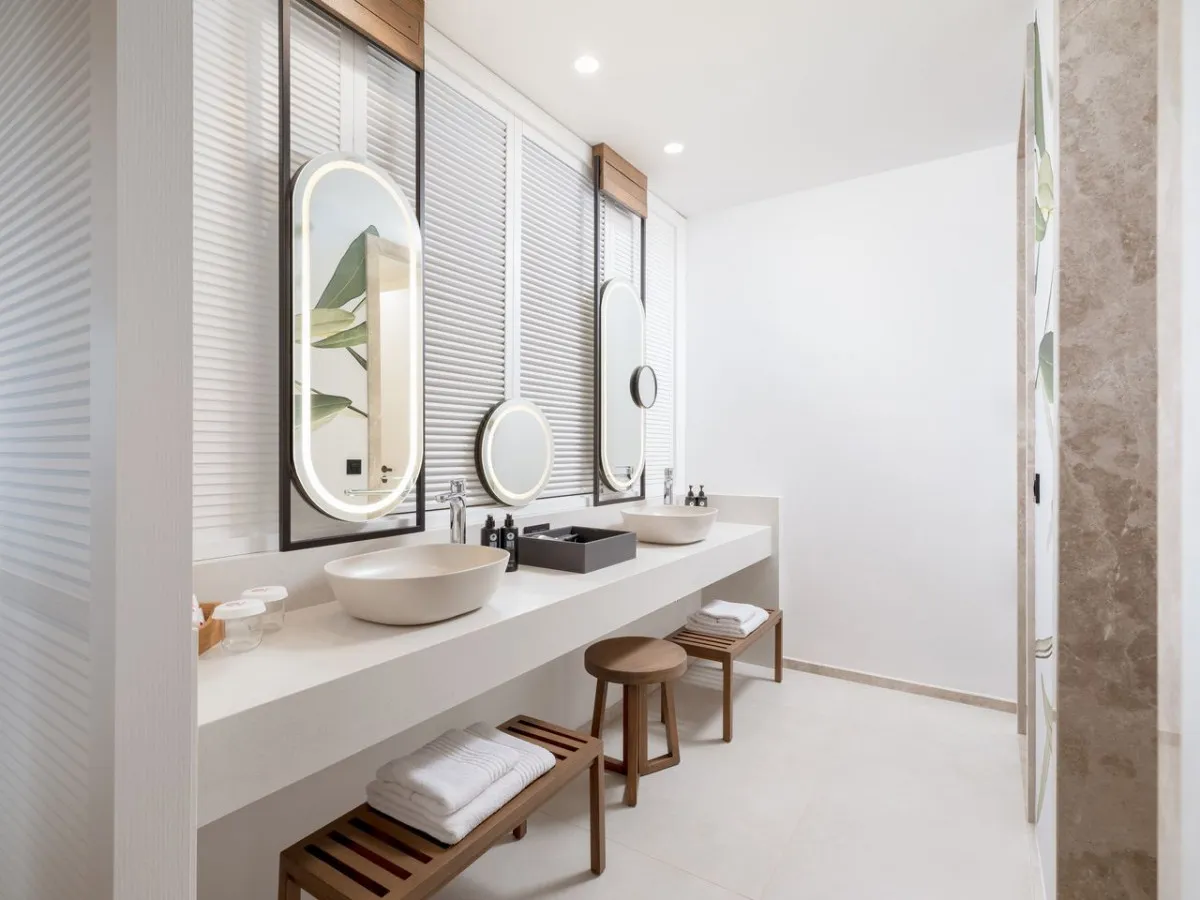 240 м2 (включая сад), вилла состоит из большой гостиной, трех спален и кухни. В гостиной: мягкая мебель, обеденный стол, в двух спальнях – большие двуспальные кровати. В третьей спальне – 2 кровати queen-size. Между гостиной и спальнями есть двери. Столик и зеркало для макияжа, гардеробная. В номере есть 3 отдельные ванные комнаты. На просторной террасе – собственный бассейн с подогревом, зона отдыха, обеденный стол, 6 шезлонгов и софа. Количество гостей: 6Bayou Вилла c 3 спальнями и видом на море (3+1 номер) (6 чел) (Семейная зона)