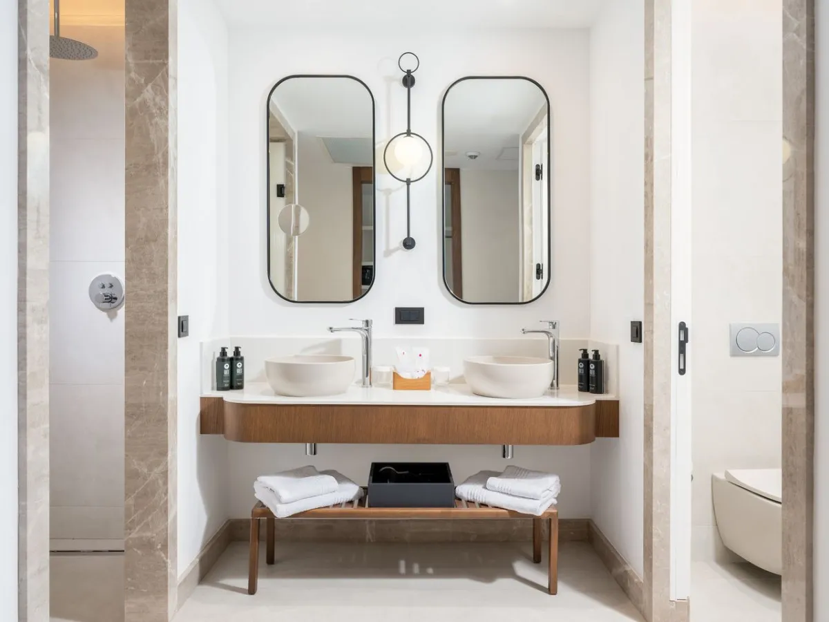 92 м2 (включая балкон), номер состоит из двух независимых делюкс-номеров, соединенных общим коридором с дверью. В номере две отдельные спальни: с 1 кроватью super king-size + кресло и с 2 полутораспальными кроватями + кресло. 2 ванные комнаты. Количество гостей: 4+1/5