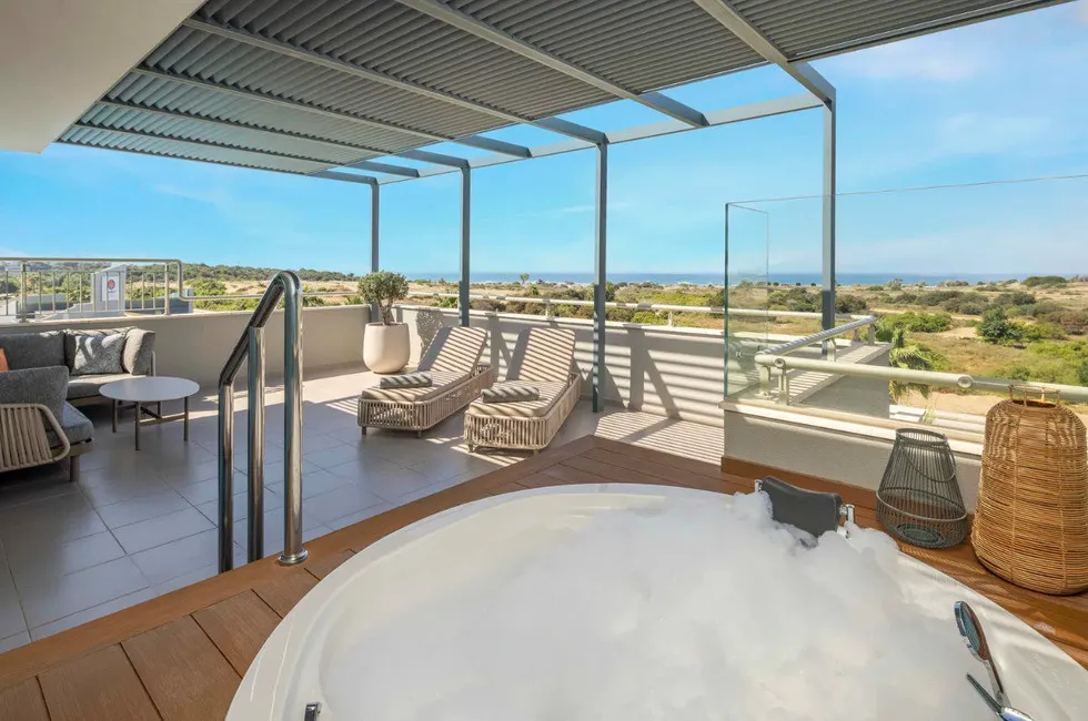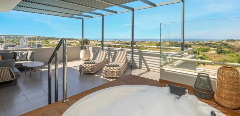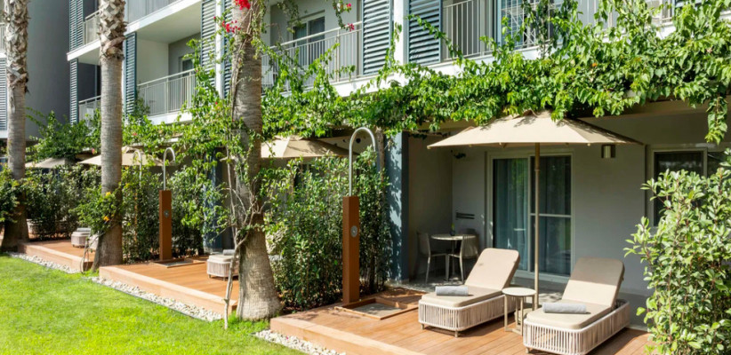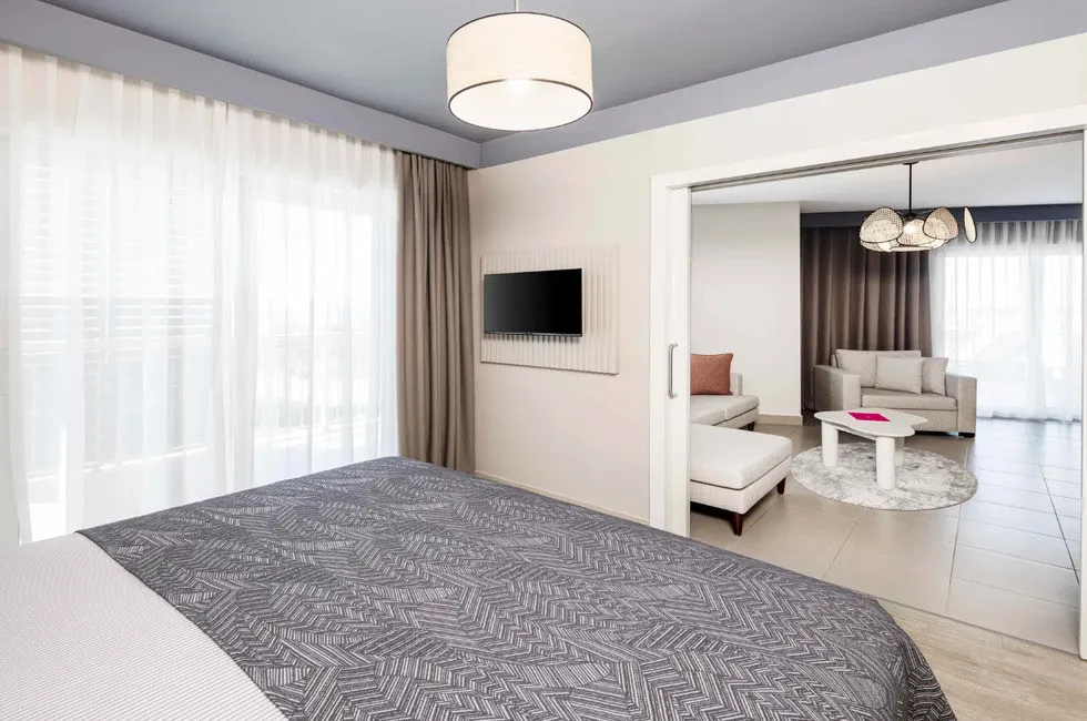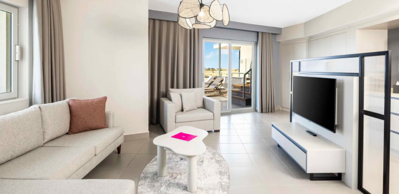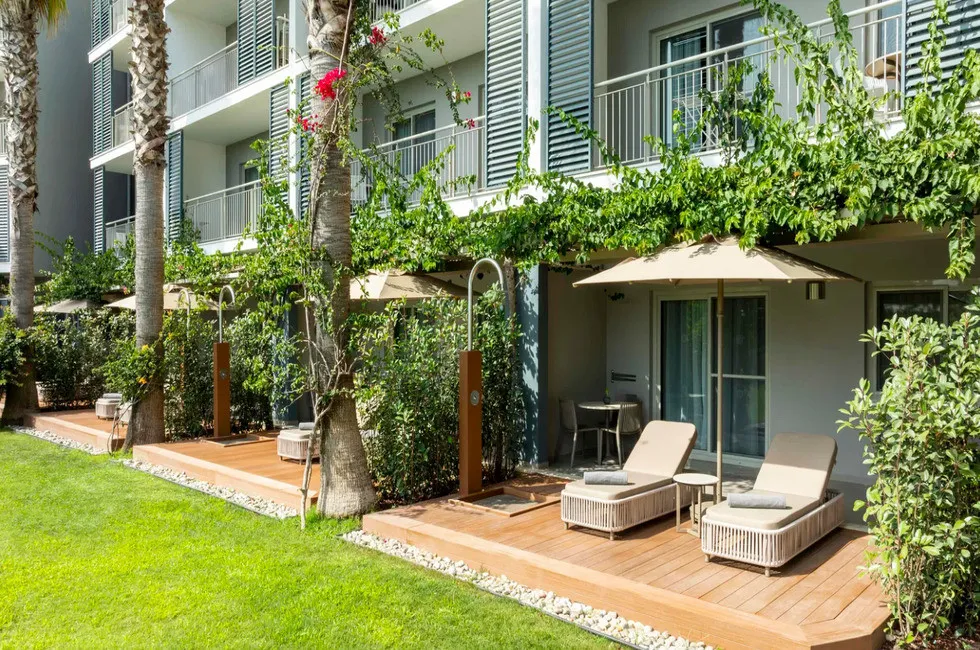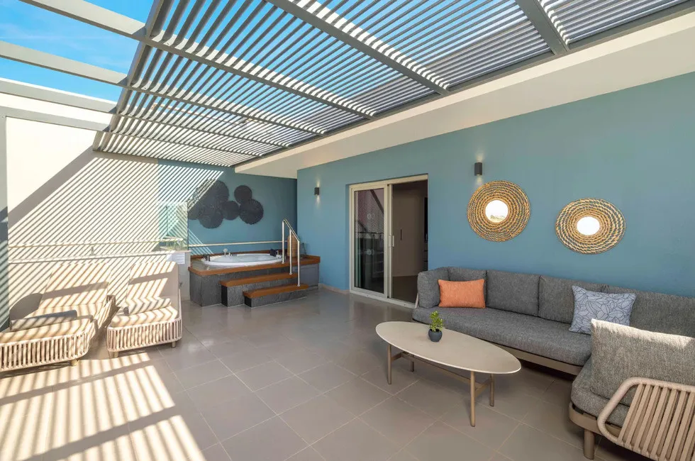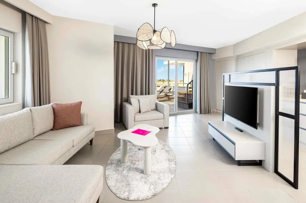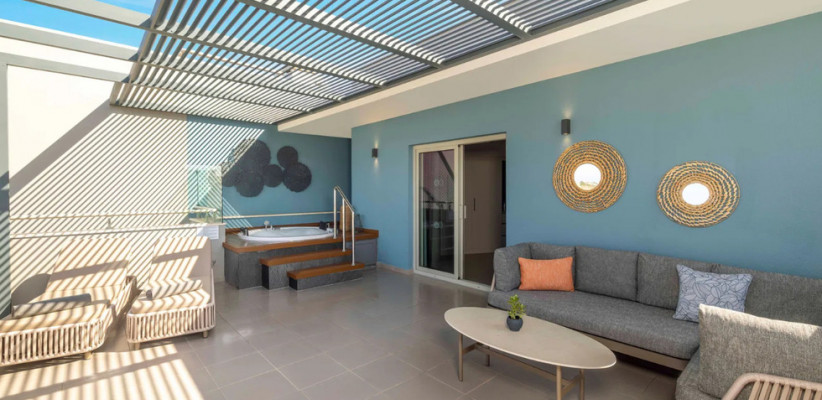 40 м2, балкон с видом на море, спальня с двуспальной кроватью размера king-size или с двумя односпальными кроватями. Максимальное количество гостей: 2.Deluxe Suite With Poolside Terrace