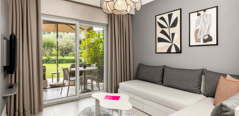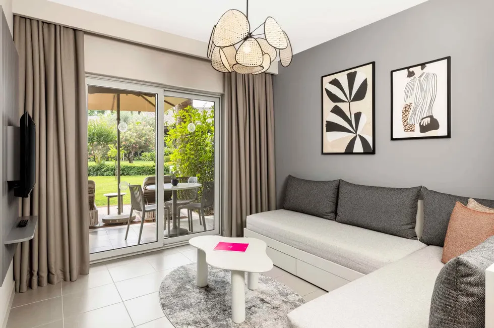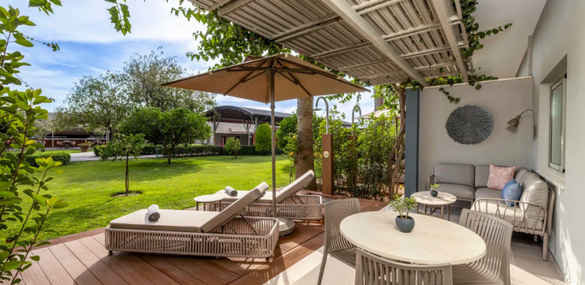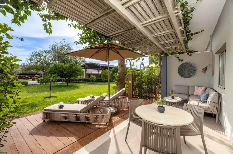 70 м2, терраса с видом на бассейн, спальня с двуспальной кроватью, две софы, гостиная. Максимальное количество гостей: 2 или 3.Deluxe Suite With Relax Garden Terrace