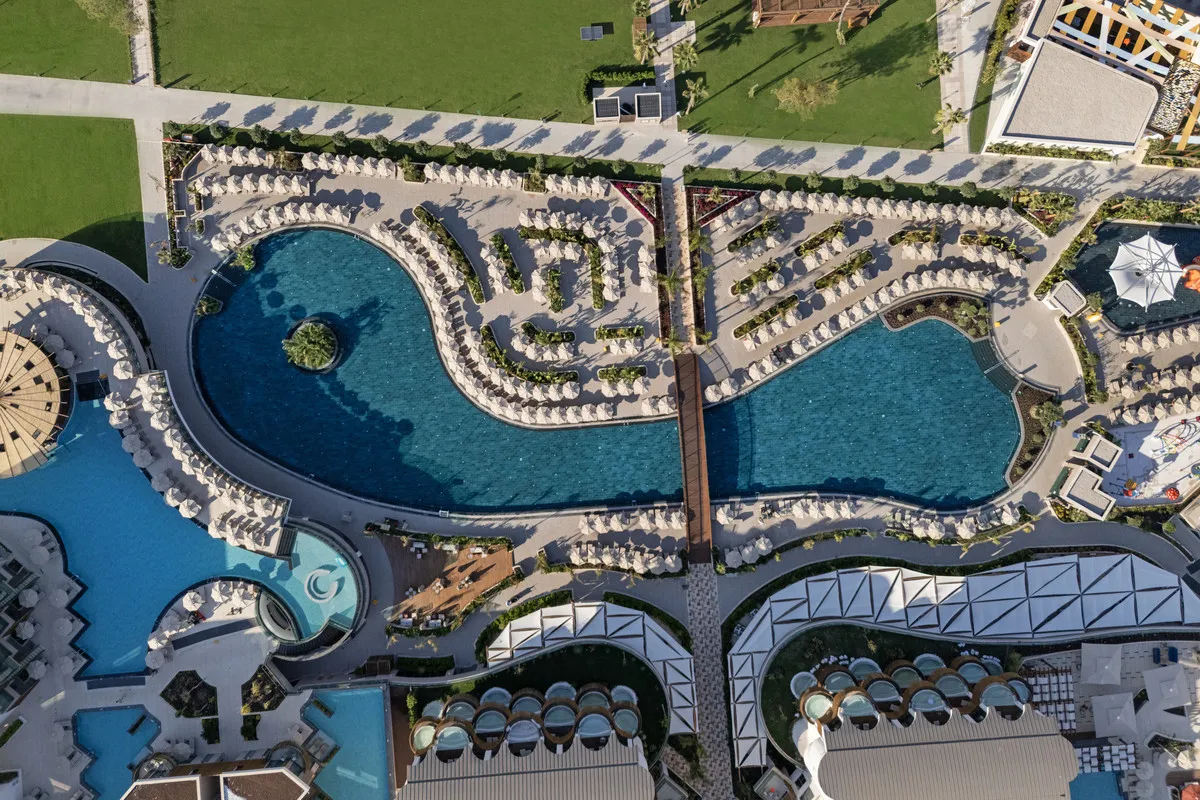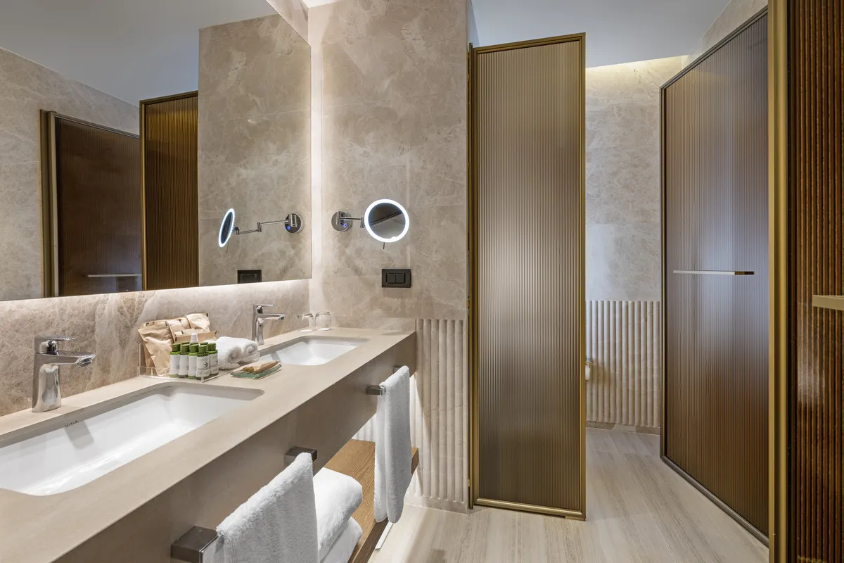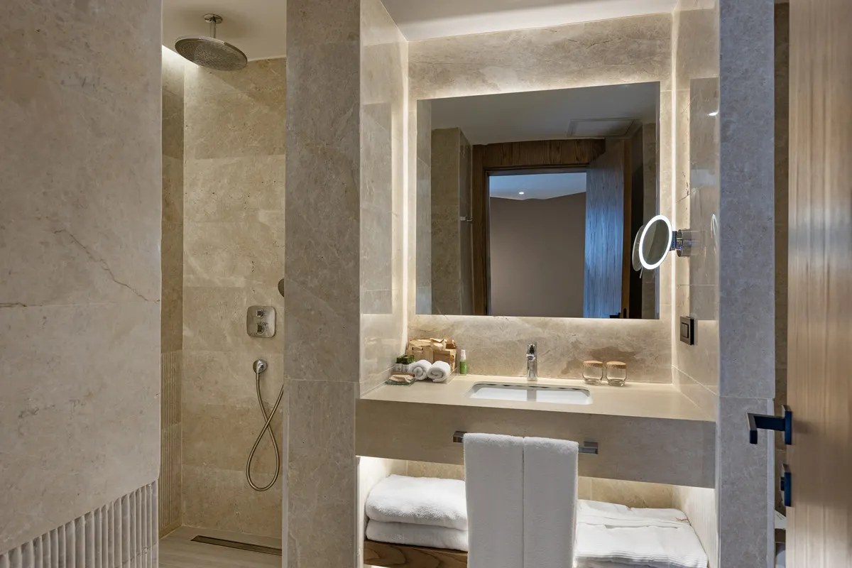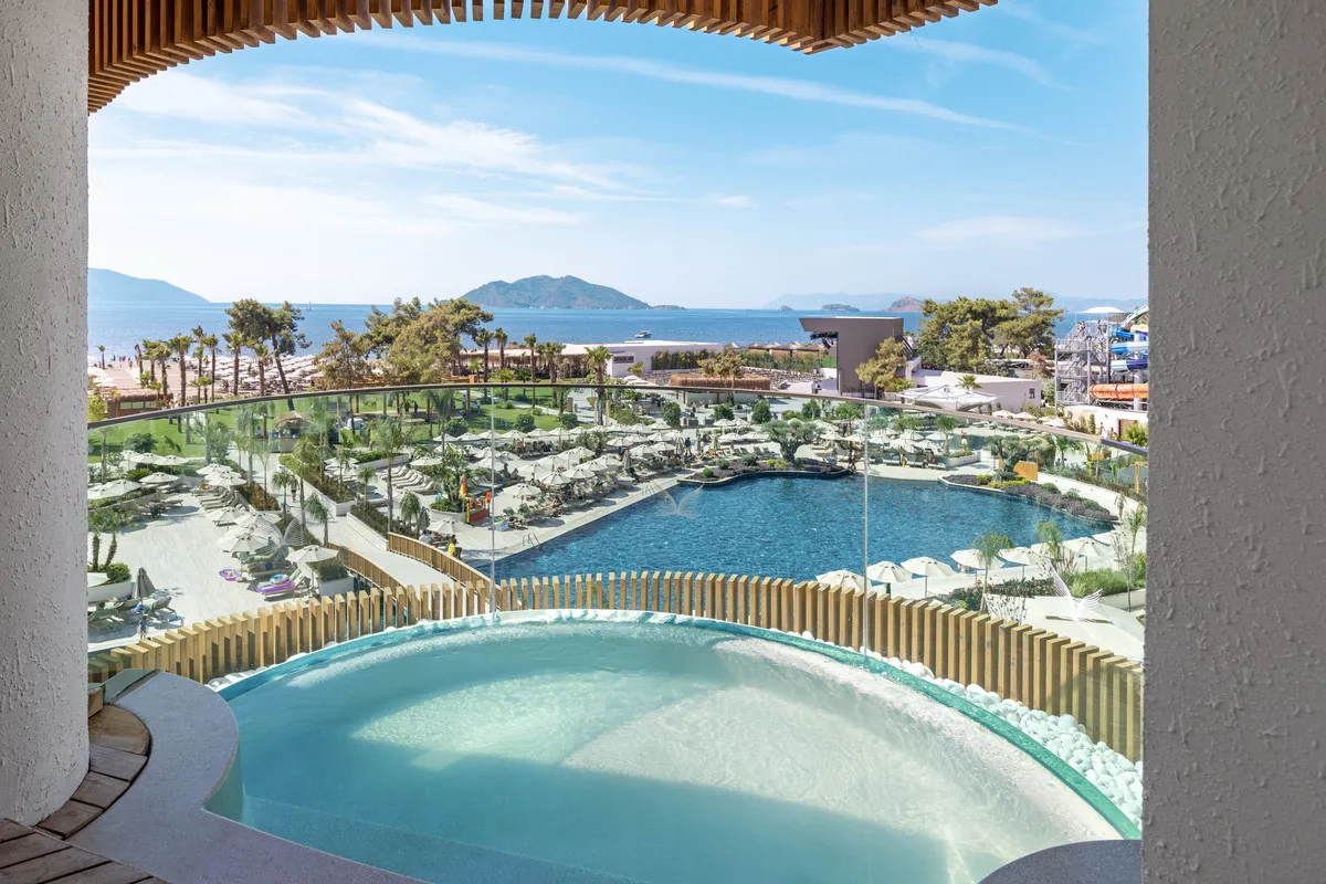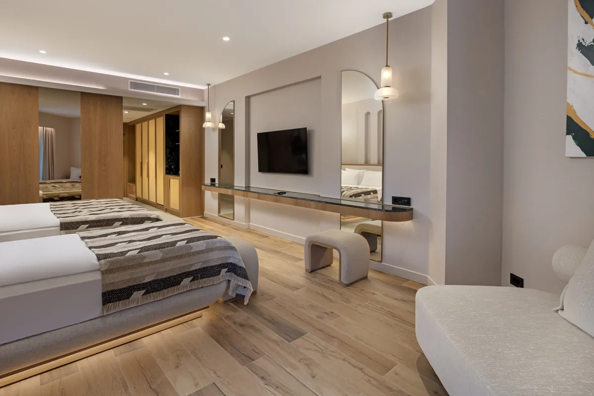 70 м2, двухкомнатный номер с двумя спальнями с дверью, двумя ванными комнатами. Есть терраса с бассейном. Площадь номера 70 м2. Открывается вид на море. Предусмотрено две спальни: в одной двуспальная кровать, в другой – две односпальные. Максимальное количество гостей: 5.