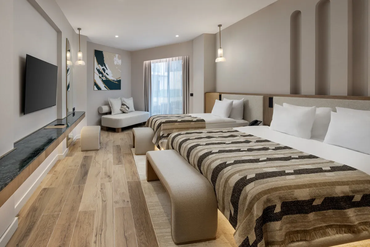 66 м2, двухкомнатный номер с межкомнатной дверью, балконом, двумя ванными комнатами. Есть две спальни с двуспальной и двумя односпальными кроватями. Максимальное количество гостей: 6.Corner Suite