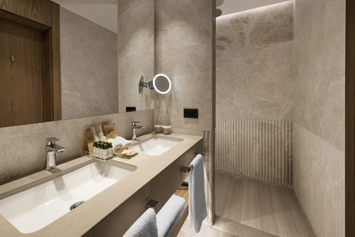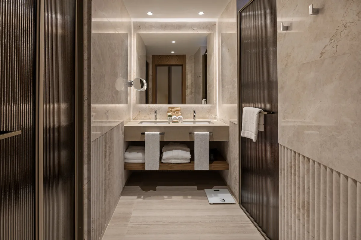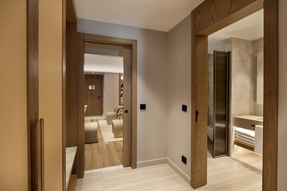165 м2, двухуровневый номер с видом на море, с гостиной на первом уровне, спальней с дверью и ванной комнатой. На втором уровне две спальни с дверьми, три ванные комнаты. Предусмотрена одна двуспальная кровать и две односпальные. В отеле 4 номера этой категории. Максимальное количество гостей: 7.Signa Junior Suite