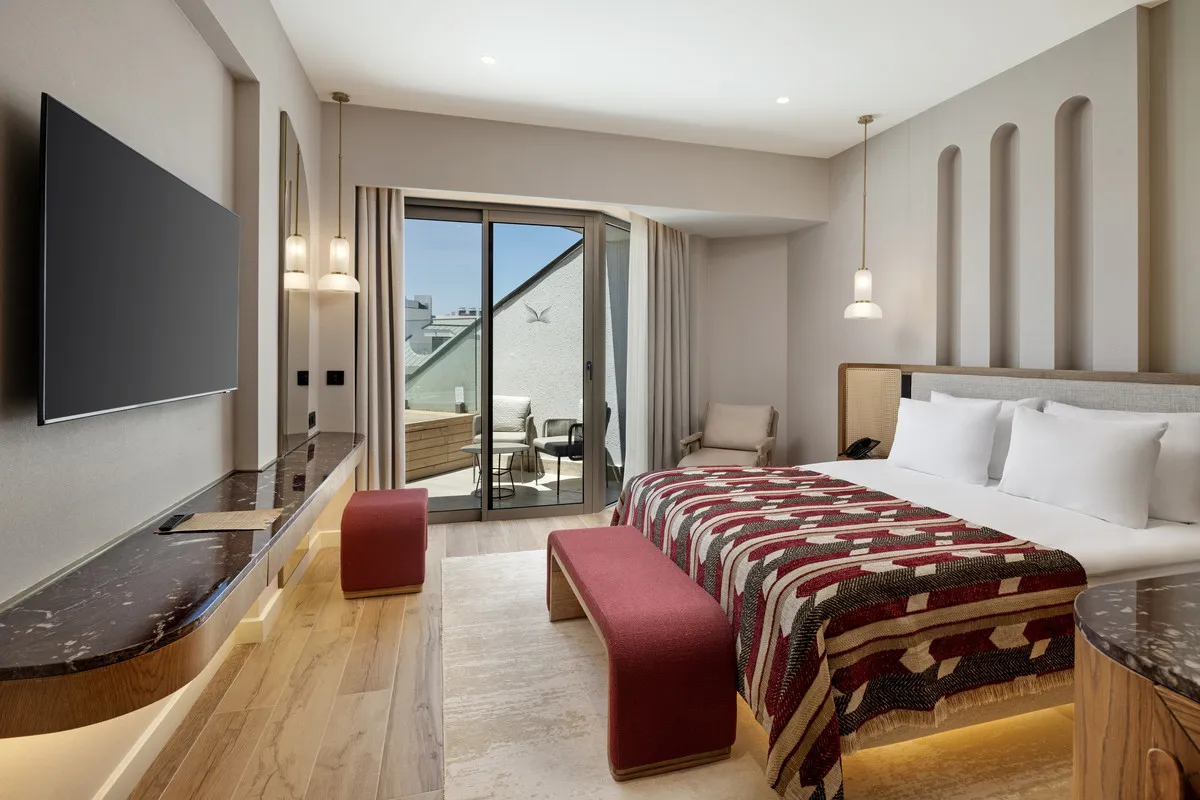 65 м2, двухкомнатный номер с гостиной, спальней с дверью и террасой с бассейном. Из окон открывается вид на море. Есть одна спальня с двуспальной кроватью. Максимальное количество гостей: 2.Signa Family Suite