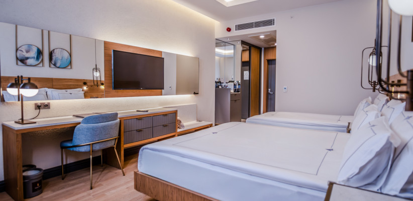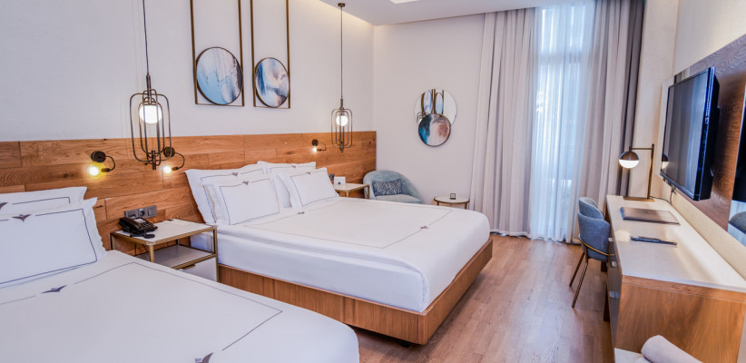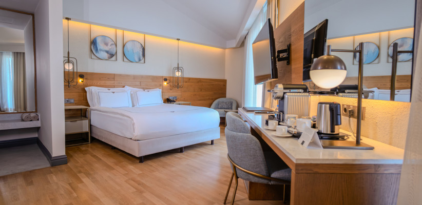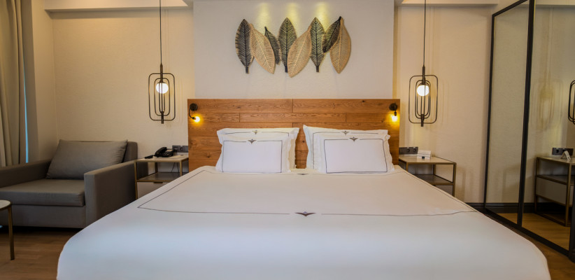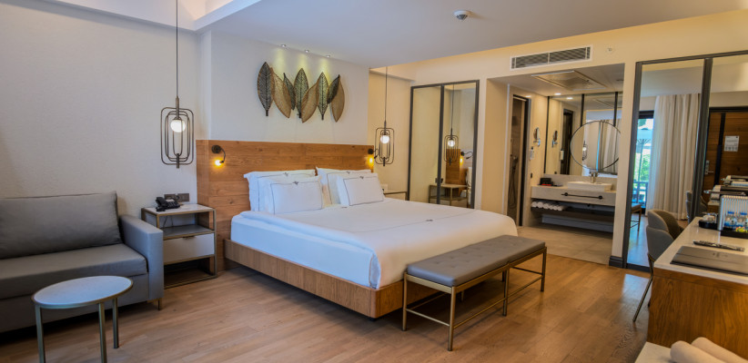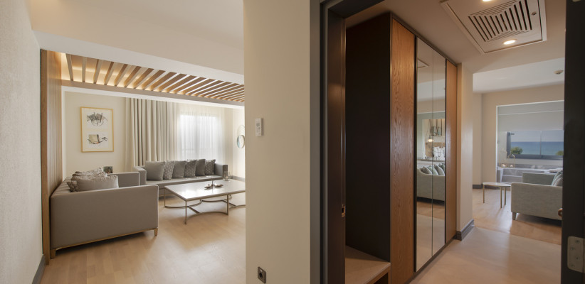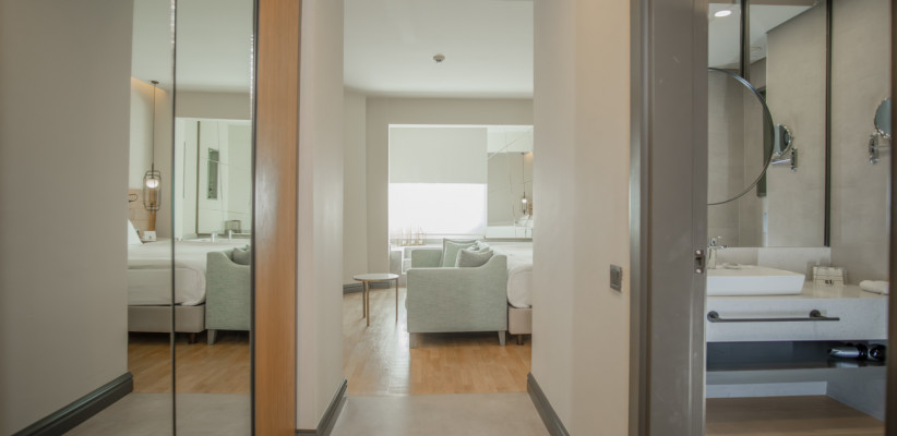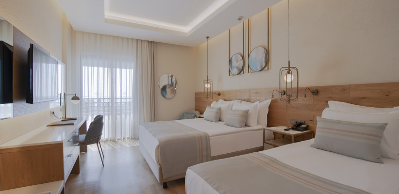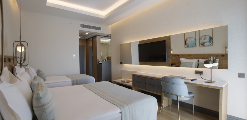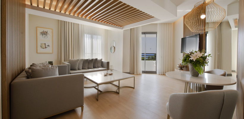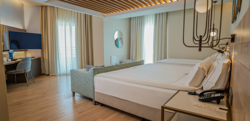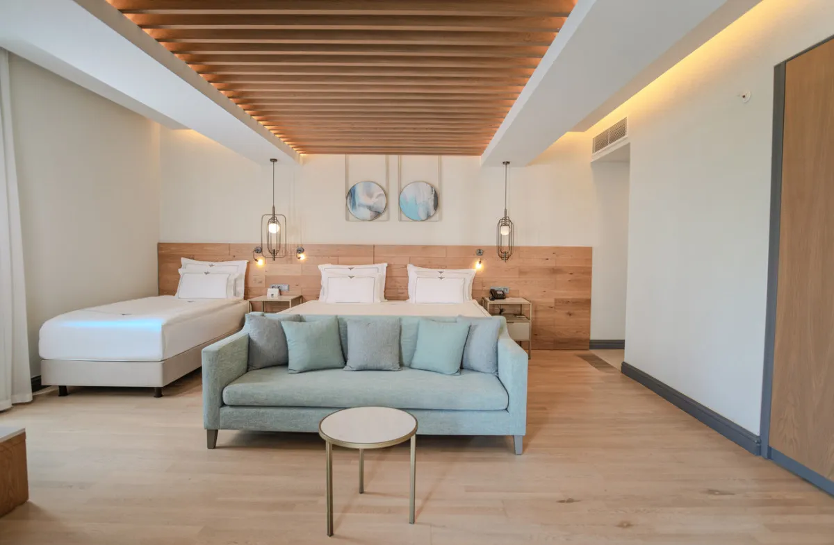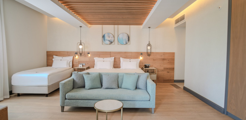 35 м2, угловой вид на море, спальня с двуспальной кроватью, с односпальной кроватью, диван, рабочее место. Максимальное количество гостей: 3 или 4.Superior Family/ Супериор семейный