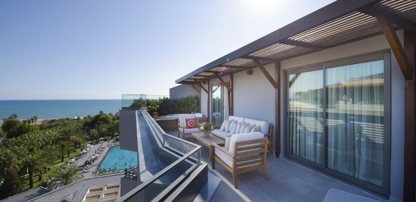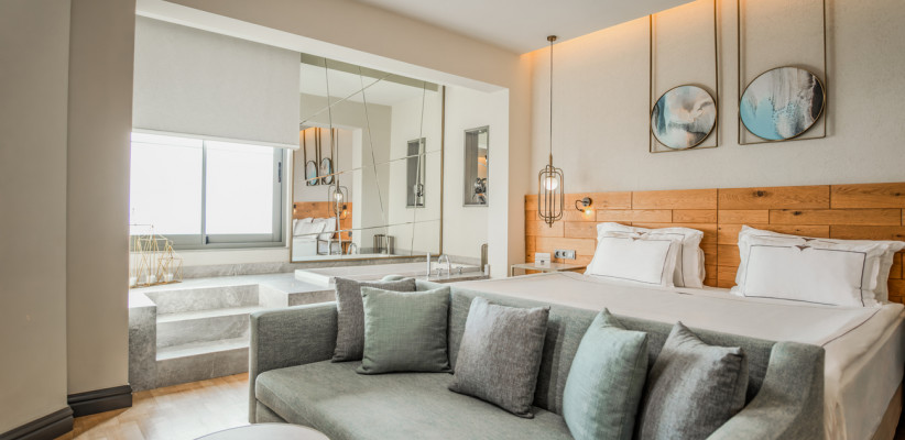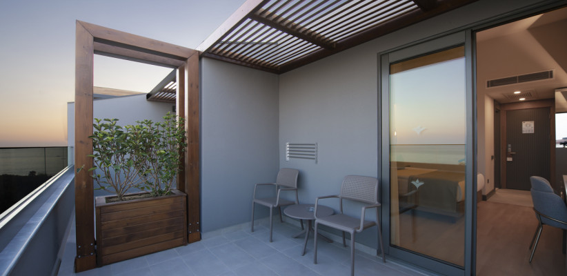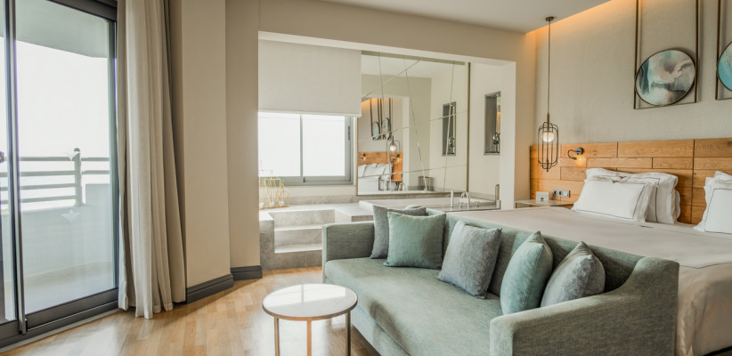 70 м2, балкон с видом на море, спальня с двуспальной кроватью размера king-size, диван, отдельная гостиная, два кресла с кофейным столиком, джакузи. Максимальное количество гостей: 3.Deluxe Terrace/ Делюкс с террасой
