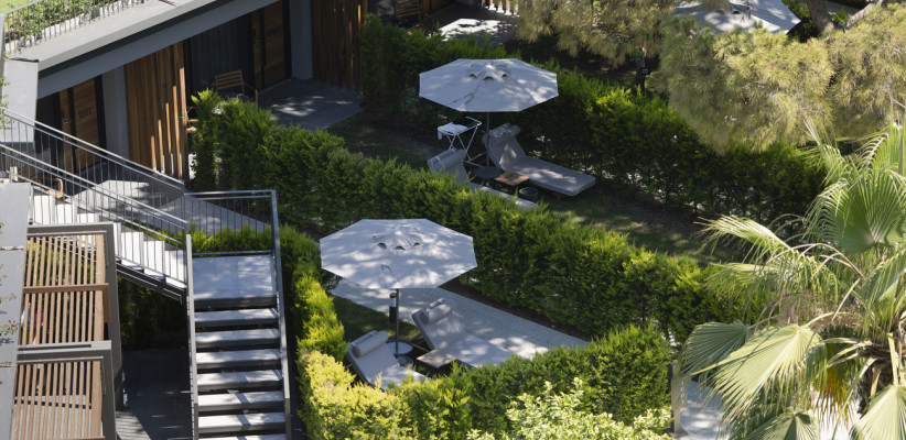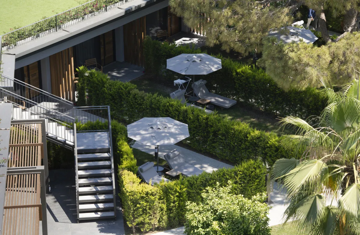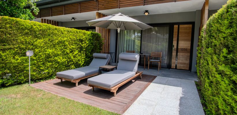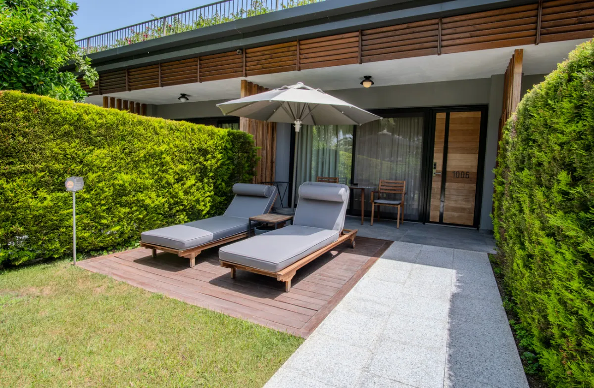 70 м2, мебелированная терраса с видом на море или окрестности, спальня с двуспальной кроватью размера king-size, кресло с кофейным столиком, рабочее место, джакузи. Максимальное количество гостей: 2.Deluxe Private Garden/ Делюкс с частным садом