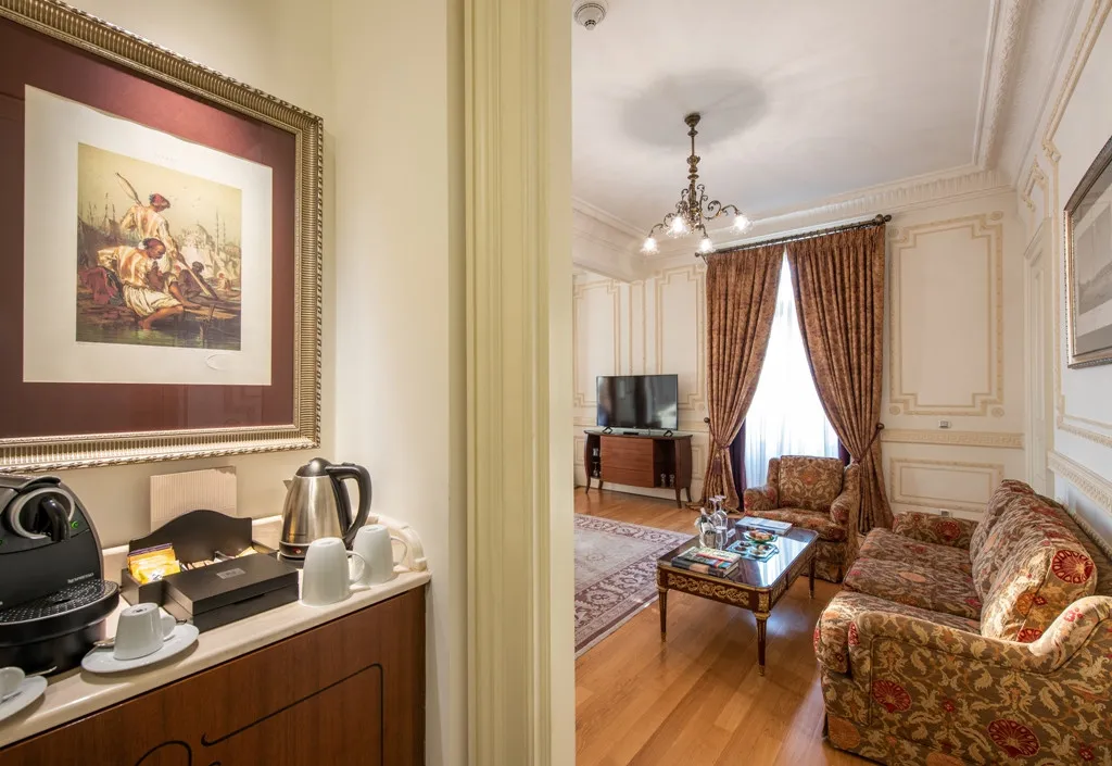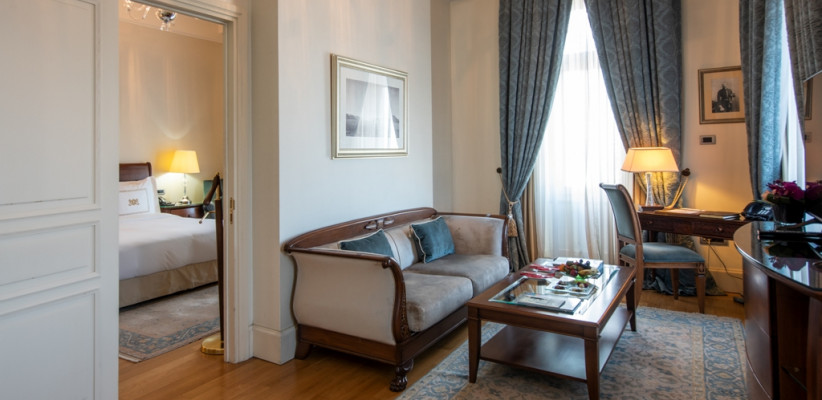 115 м2, расположены на 4 и 5 этажах отеля с видом на залив Золотой рог. Роскошные номера со спальней, гостиной, кабинетом, ванной комнатой, столовой, гардеробной и комнатой для гостей. Здесь есть кровати king-size, диваны, обеденный стол, телевизор и рабочая зона.