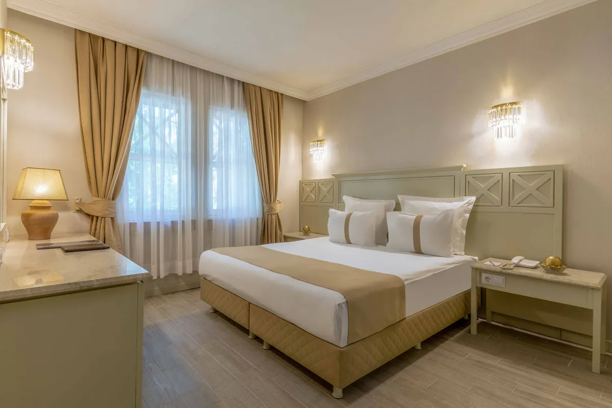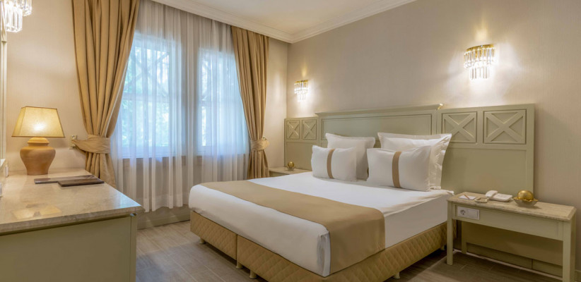 спальня с двуспальной кроватью размера king-size, отдельная гостиная, рабочее место.Deluxe Villa/ Делюкс вилла