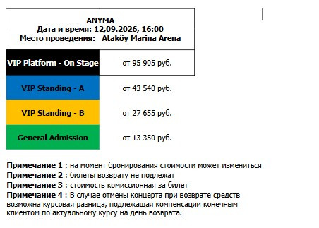 Концерт Anyma (Маттео Миллери) в Стамбуле состоится 12 сентября 2026 года на площадке Atakoy Marina Arena. Артист представит свое новое масштабное аудиовизуальное шоу под названием «Aeden», которое является частью его мирового турне.