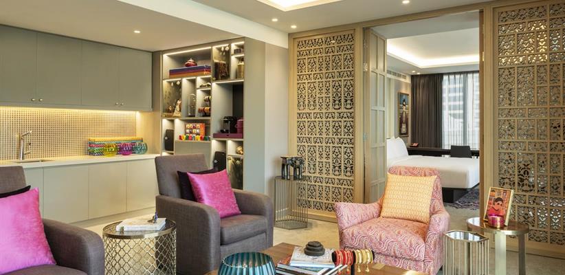 Theme Suite – площадь 64 кв. м, максимальное размещение 3 человека, кровать king-size, спальня, гостиная с мини-кухней, номер в индийском стиле.