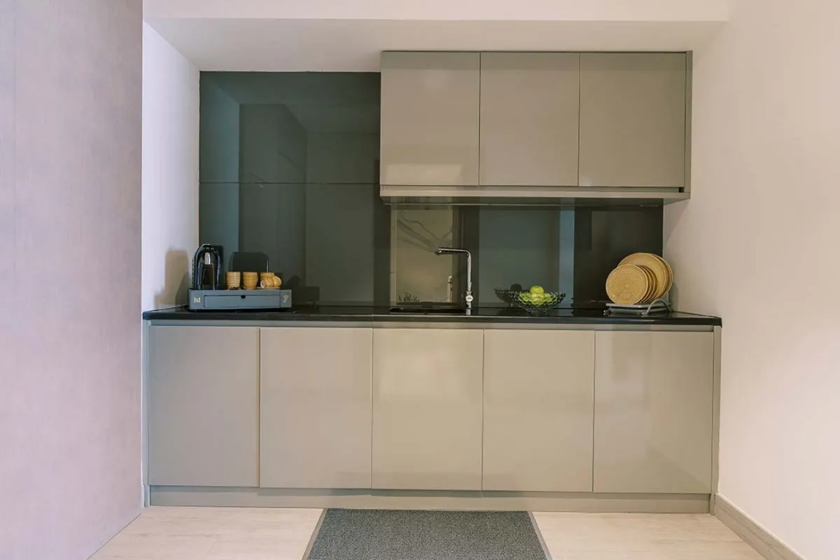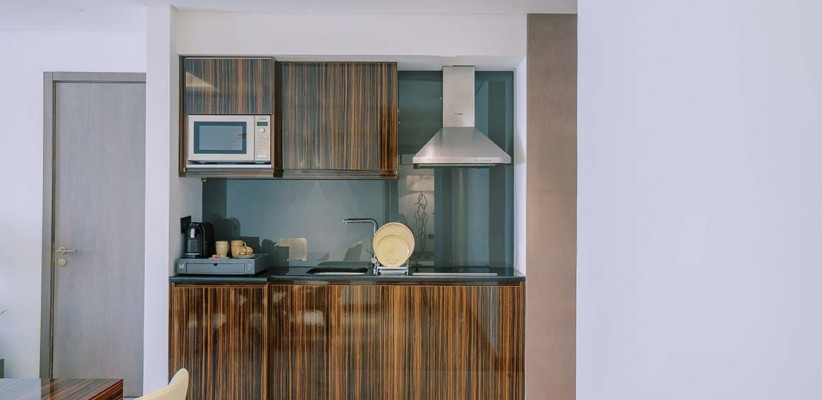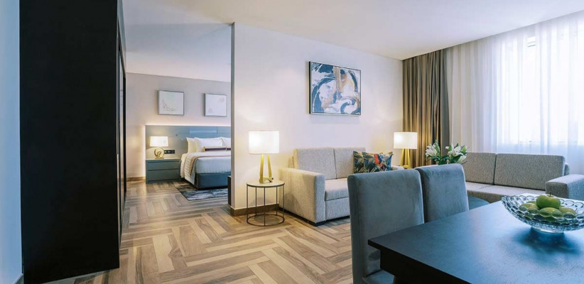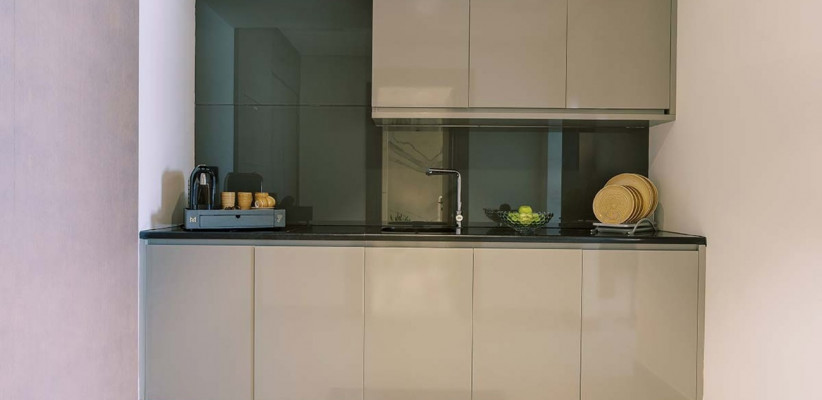 50 м2, панорамные окна с видом на город, спальня с двуспальной кроватью размера king-size, диван с кофейным столиком, рабочая зона, оборудованная мини-кухня. Максимальное количество гостей: 2 или 3.Family Suite