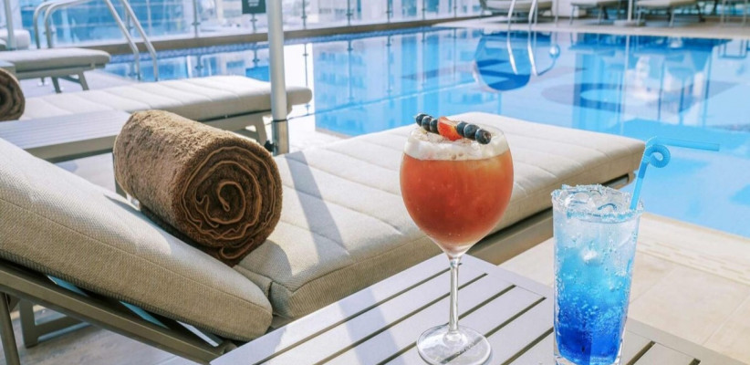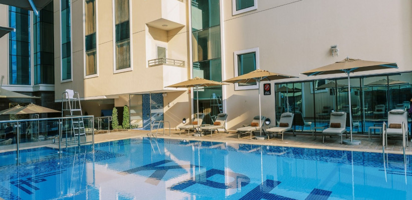 - Просторный открытый бассейн, который окружен удобной зоной для загара с мягкими шезлонгами и зонтиками.