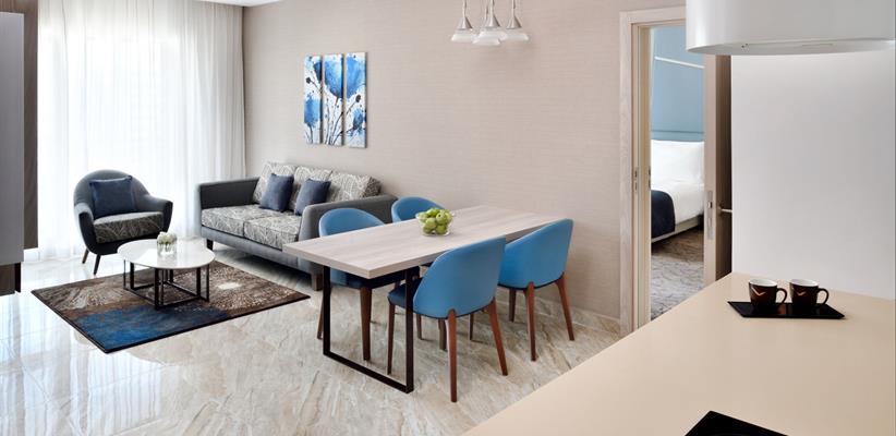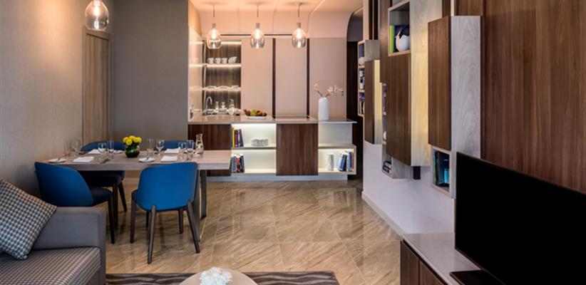 Family Three Bedroom Apartment площадью 143 кв. м., размещением 6+2 чел., с тремя спальнями, в одной – кровать размера king-size, а в двух – две односпальные кровати, двумя ванными комнатами, гостиная и обеденная зона, полностью оборудованная кухня (плита, духовка, микроволновая печь и стиральная машина, посудомоечная машина).