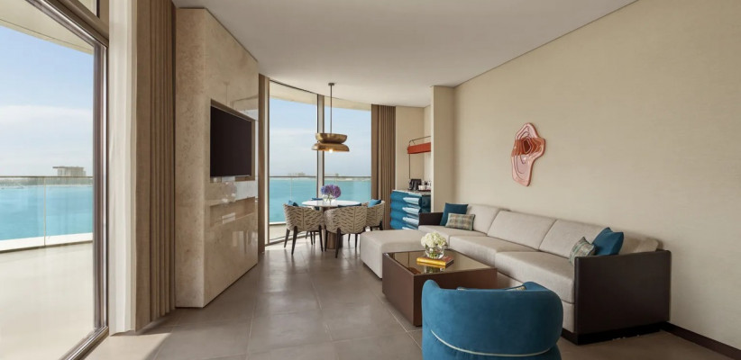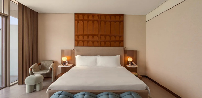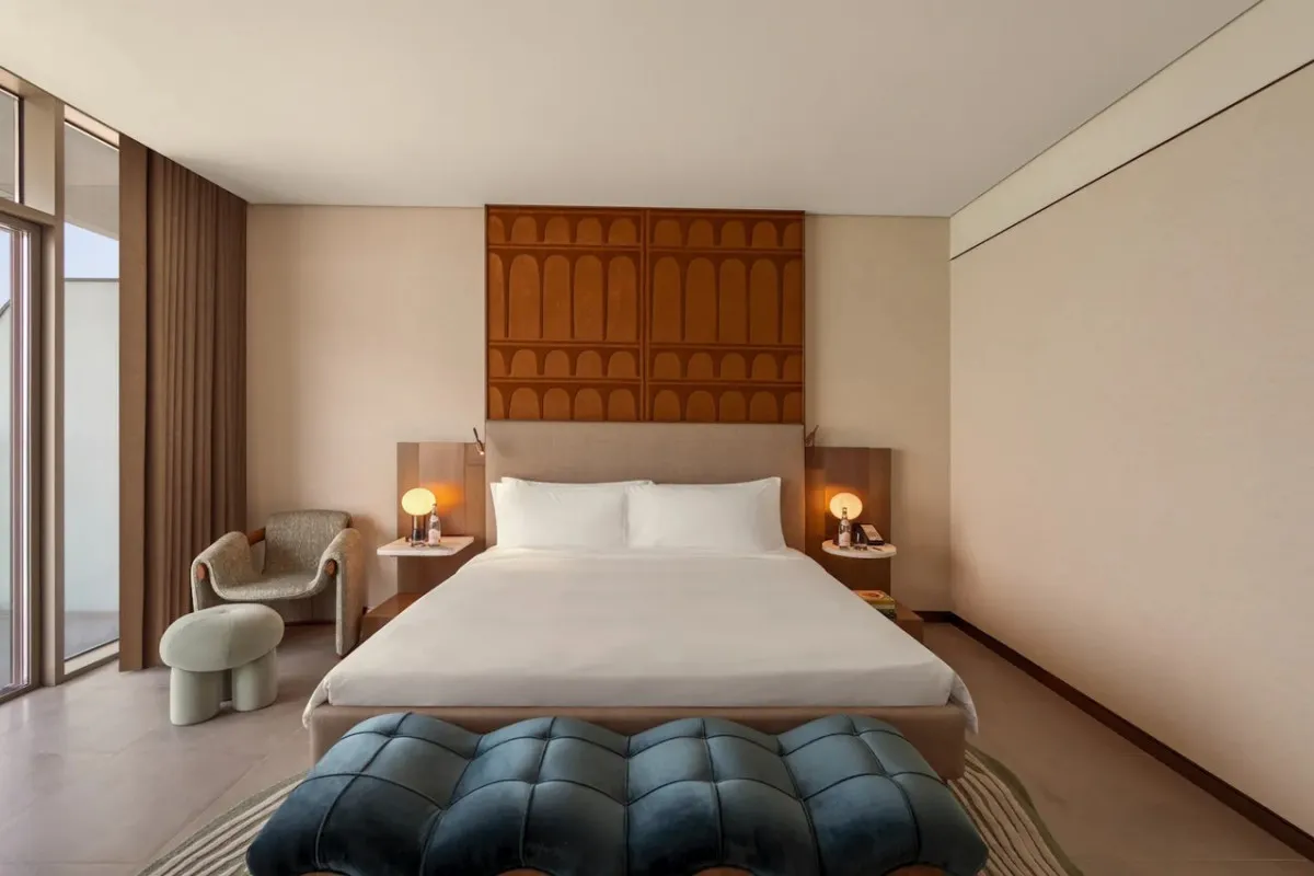 So/ Ras Al Khaimah предлагает номера и люксы, вдохновленные окружающей природой: морские цвета, натуральные материалы (светлое дерево, бронза) и современная мебель.