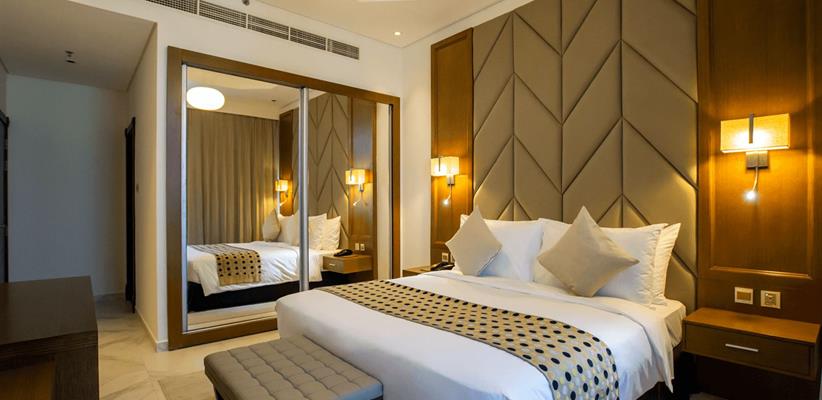 Two Bedroom – площадь 112 кв. м, размещение 4 гостя. В номере три комнаты, двуспальная кровать размера king-size и две односпальные кровати, гостиная с обеденной зоной, ванная комната с ванной, панорамные окна, вид на город. Номер с балконом по запросу.